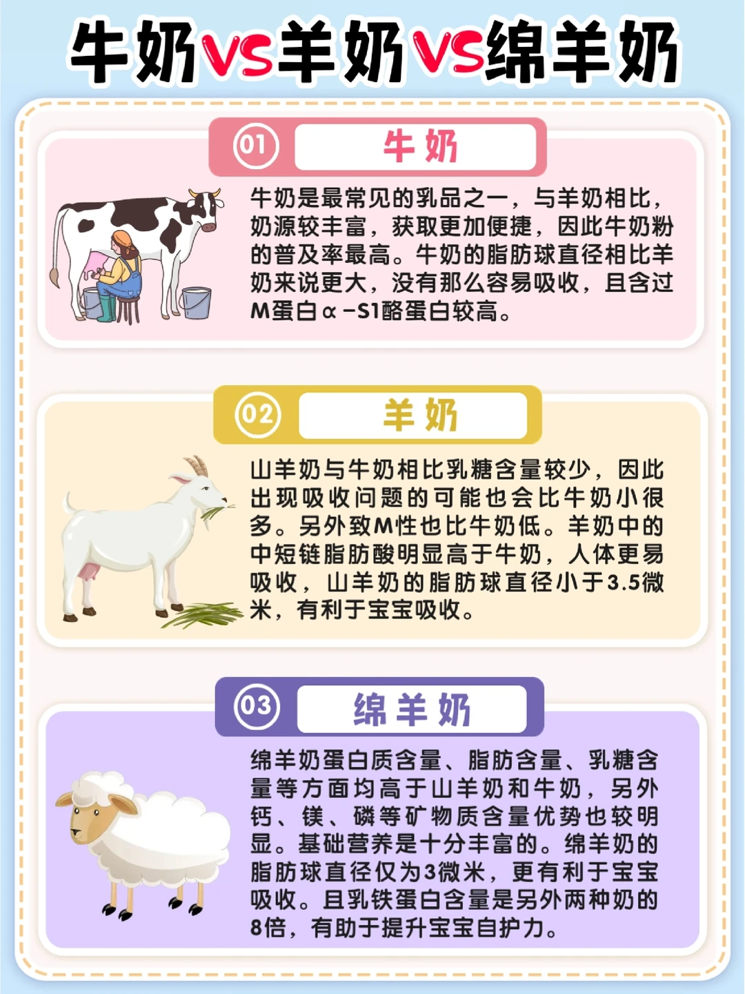 相较被大家熟知的牛奶,羊奶因富含天然A2蛋白,具有低致M的优势;而现在市面上的羊奶粉主要分为山羊奶粉和绵羊奶粉,其分子大小比较为:牛奶(4.55μm)>山羊奶(3.49μm)>绵羊奶(3.3μm),可以看出绵羊奶分子更小,在吸收上更具优势,不仅如此,绵羊奶中的天然乳铁蛋白含量是牛奶和山羊奶的8倍,能够更好提升宝宝自护力💪,因此绵羊奶粉天然具有独特的、难比拟的品类优势👑!