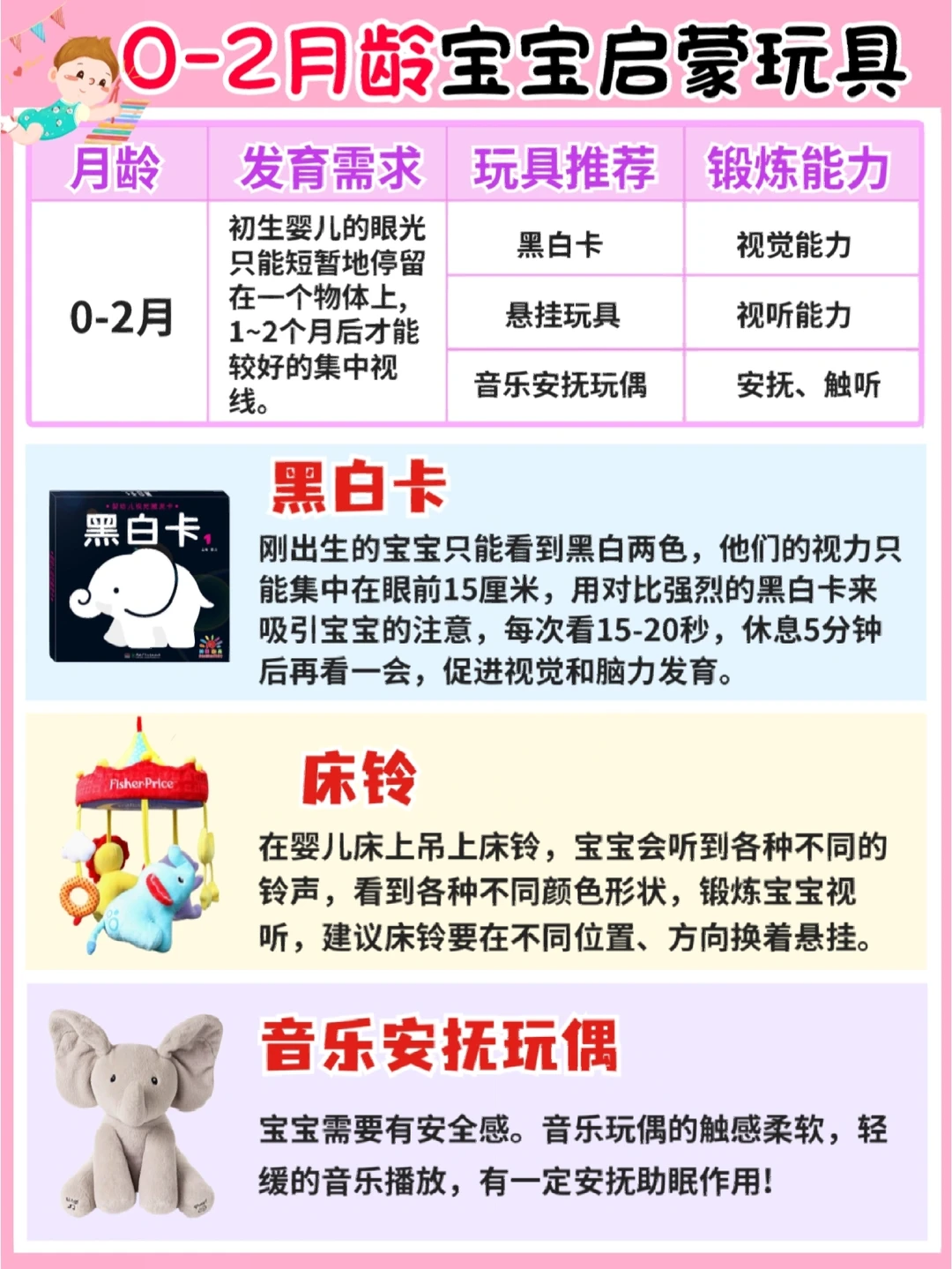 玩具:黑白卡、安抚玩偶、床铃