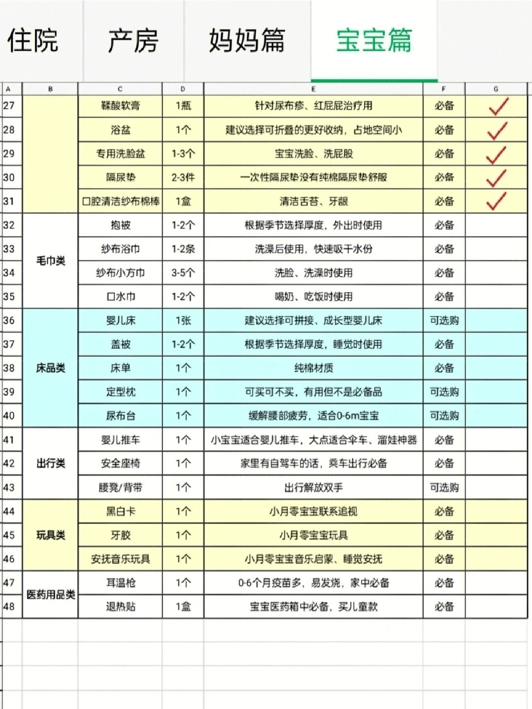 3. 后面一栏可以帮助孕妈跟踪准备进度,准备好的物品可“✔”哦。