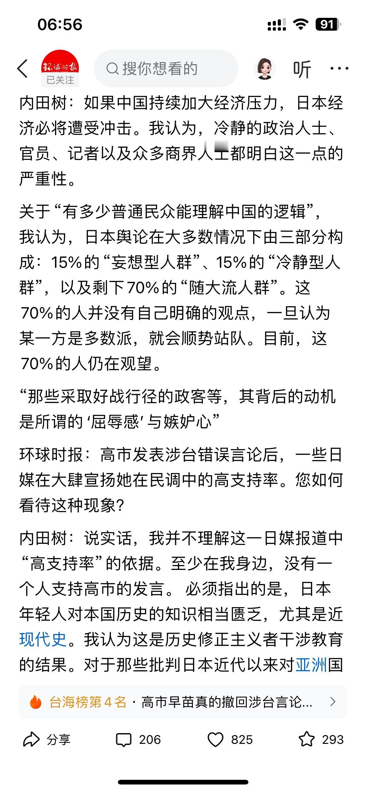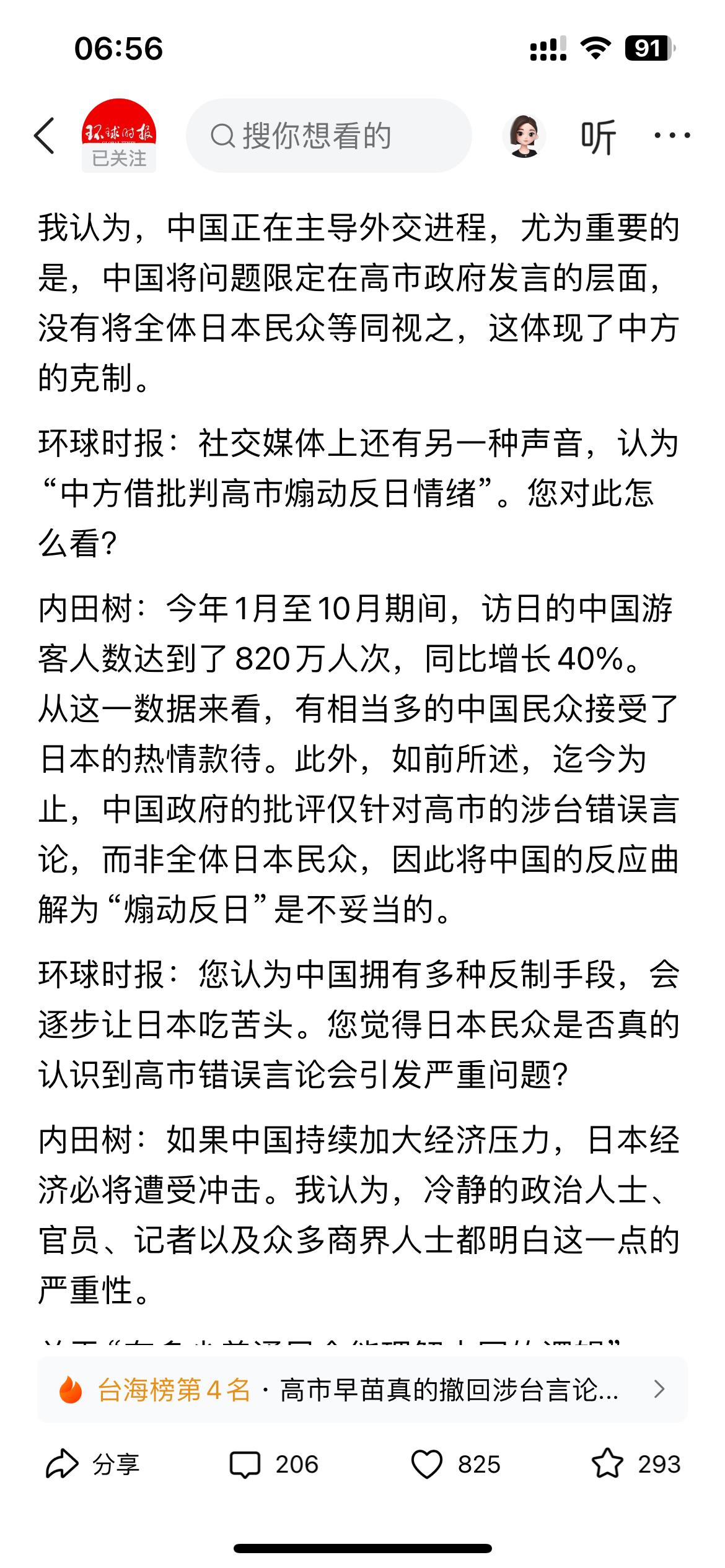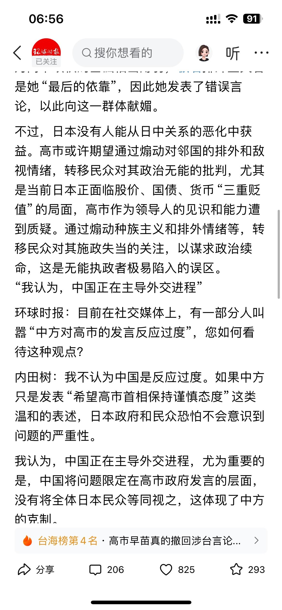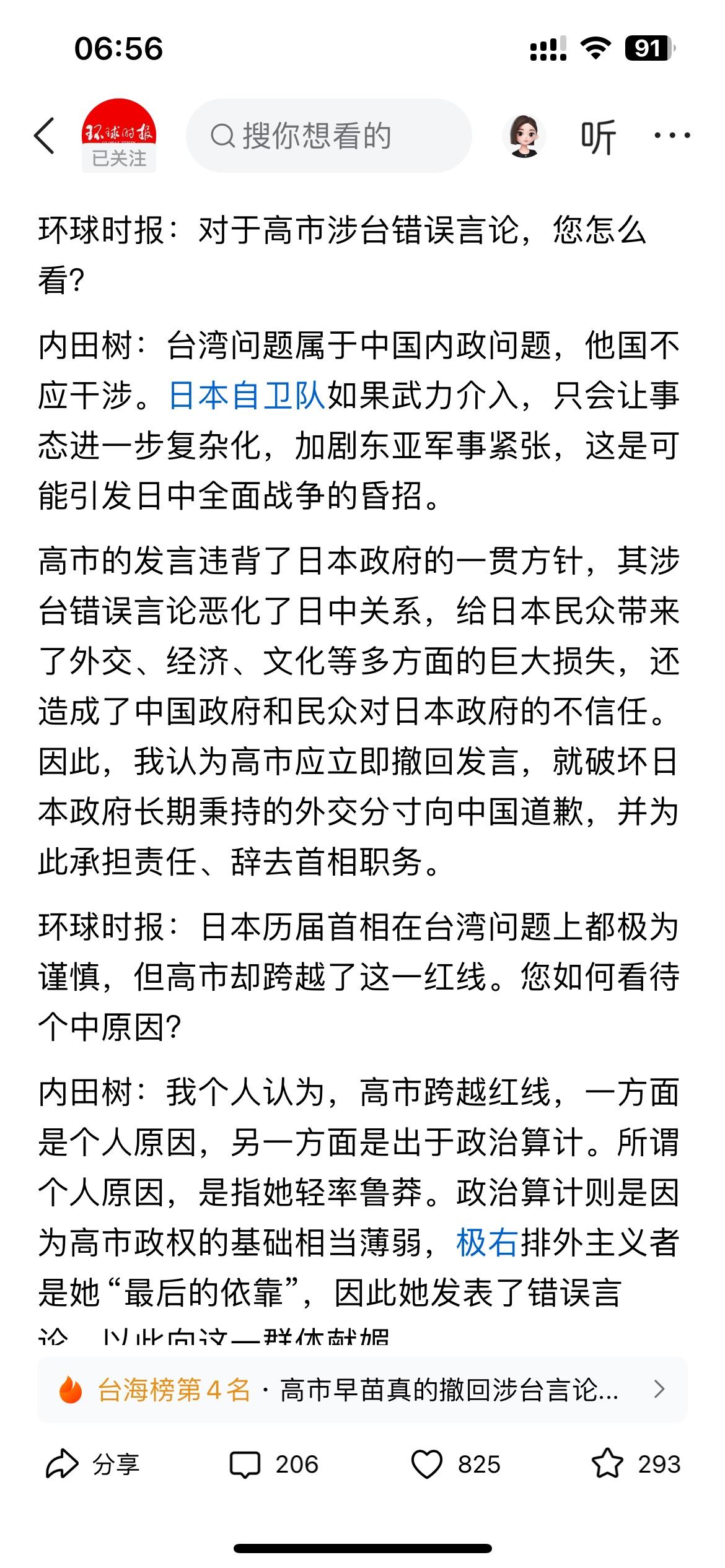 看到这个标题以为真的是高市撤回错误言论并向中国道歉,结果赶紧来看内容,原是环球时报记者对内田树的专访,再看标题成了高市应撤回错误言论并向中国道歉! 真是一个“应”字让C字发音的字直接喷薄欲出!环球时报的观点果然很好!标题起的果然很高明!真是实在佩服!