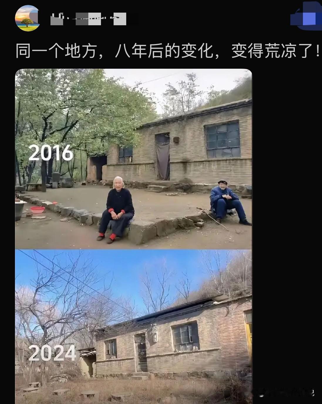 空巢老人现象以后可能将迅速变成空巢现象,这两张对比照太让人感慨了。还记得前两天看哭无数网友的男子跪别祖宅的视频吗?因为类似空巢现象实在是越来越多了。之前的空巢老人现象大概是进城务工和城市化进程的必然结果,在农村老宅里面剩下的就基本只有老人小孩了,尤其是老人居多。随着这批老人的离开,那些老宅子会迅速荒芜。最终就会呈现出对比照上的那种感觉,是不是有种沧海桑田的感觉?