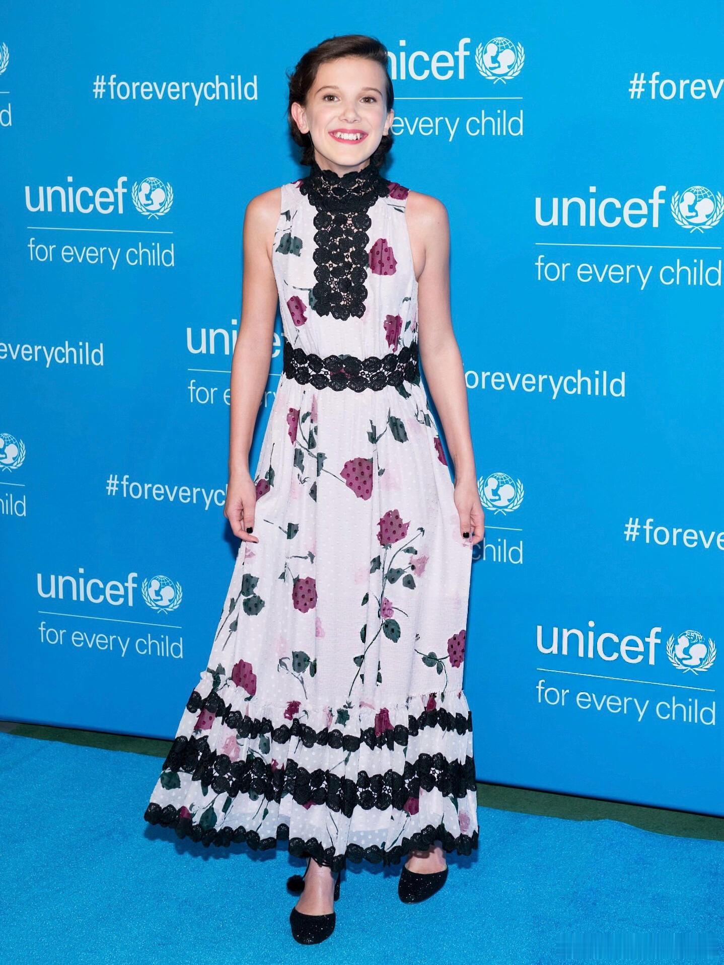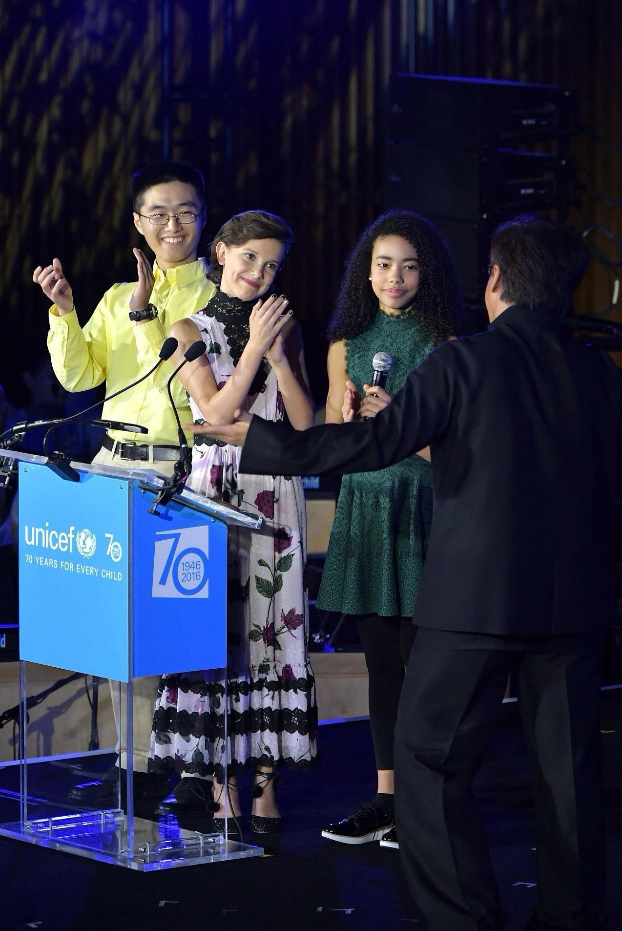 2016年《怪奇物语》小11扮演者Millie Bobby Brown受邀主持联合国儿童基金会70周年庆典活动,当时12岁。