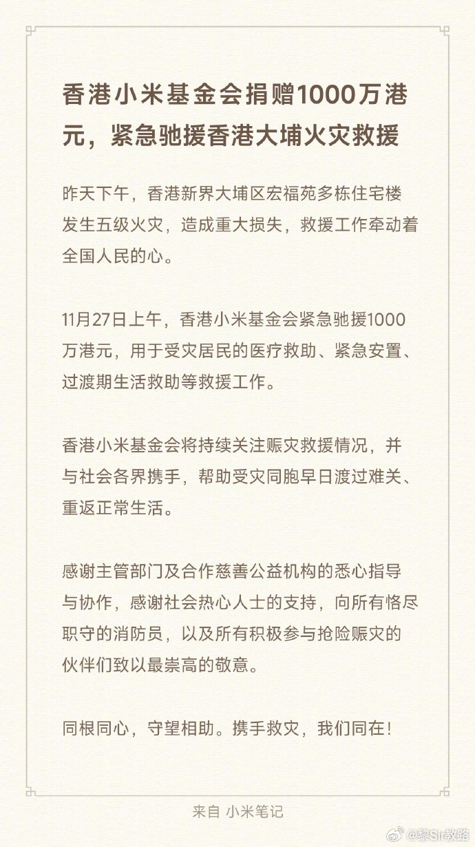 在灾难面前果断申请援手,小鹏、小米、比亚迪。必须无差别地给予点赞的。大v聊车香港大埔火灾紧急救援行动