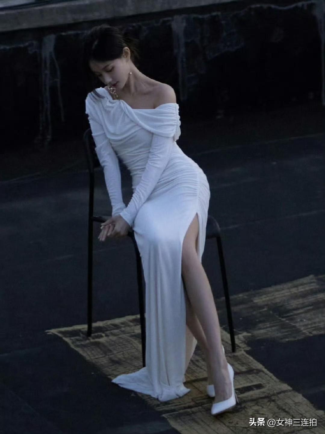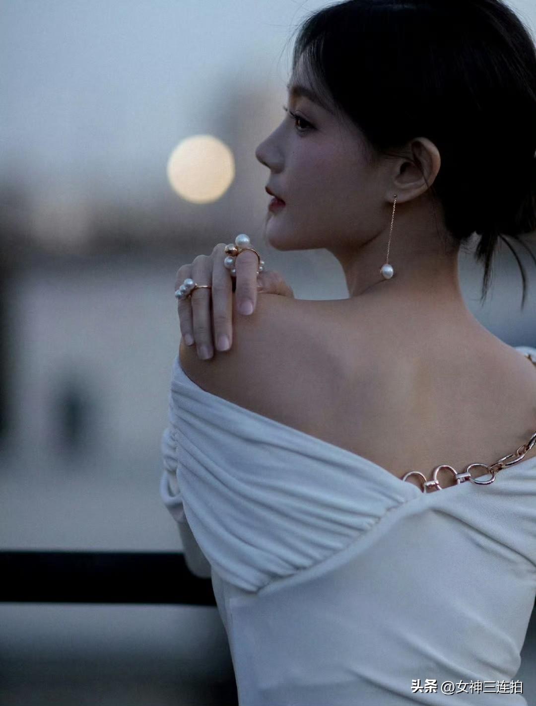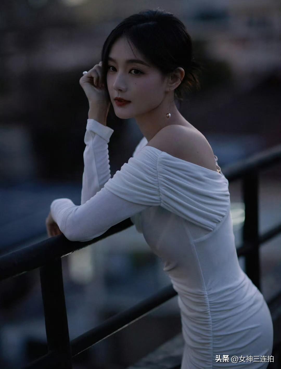 这姑娘穿着晚礼服站在栏杆旁,真优雅!