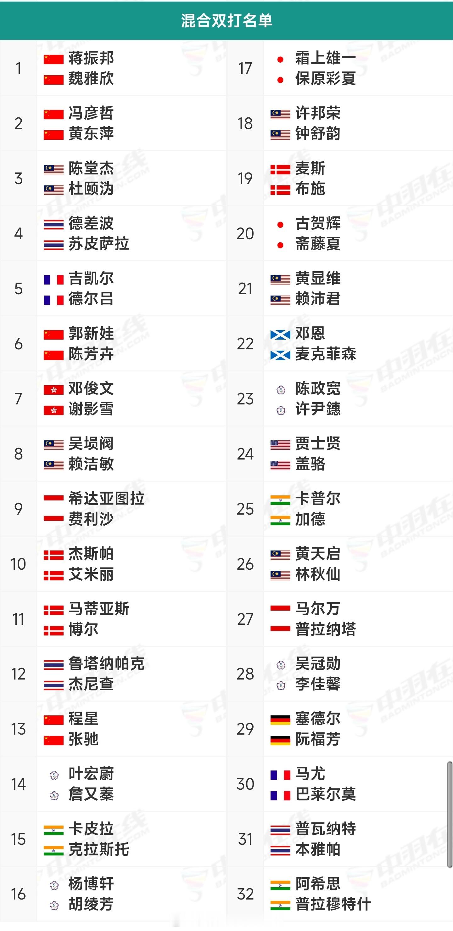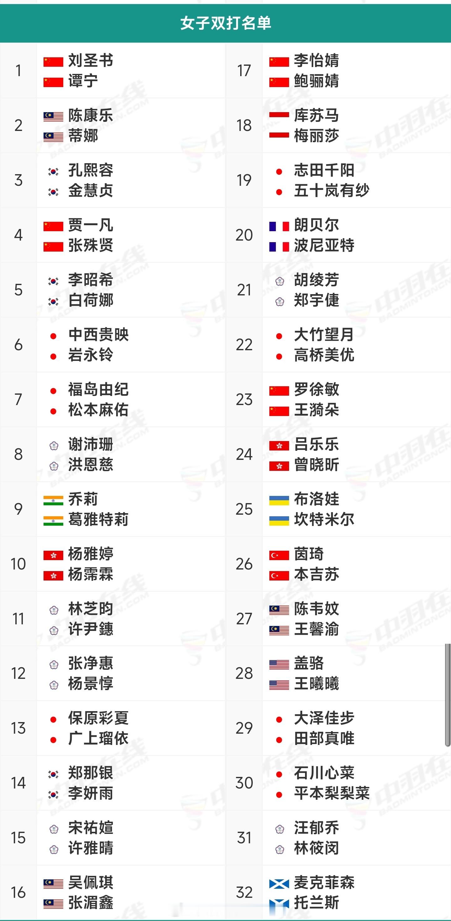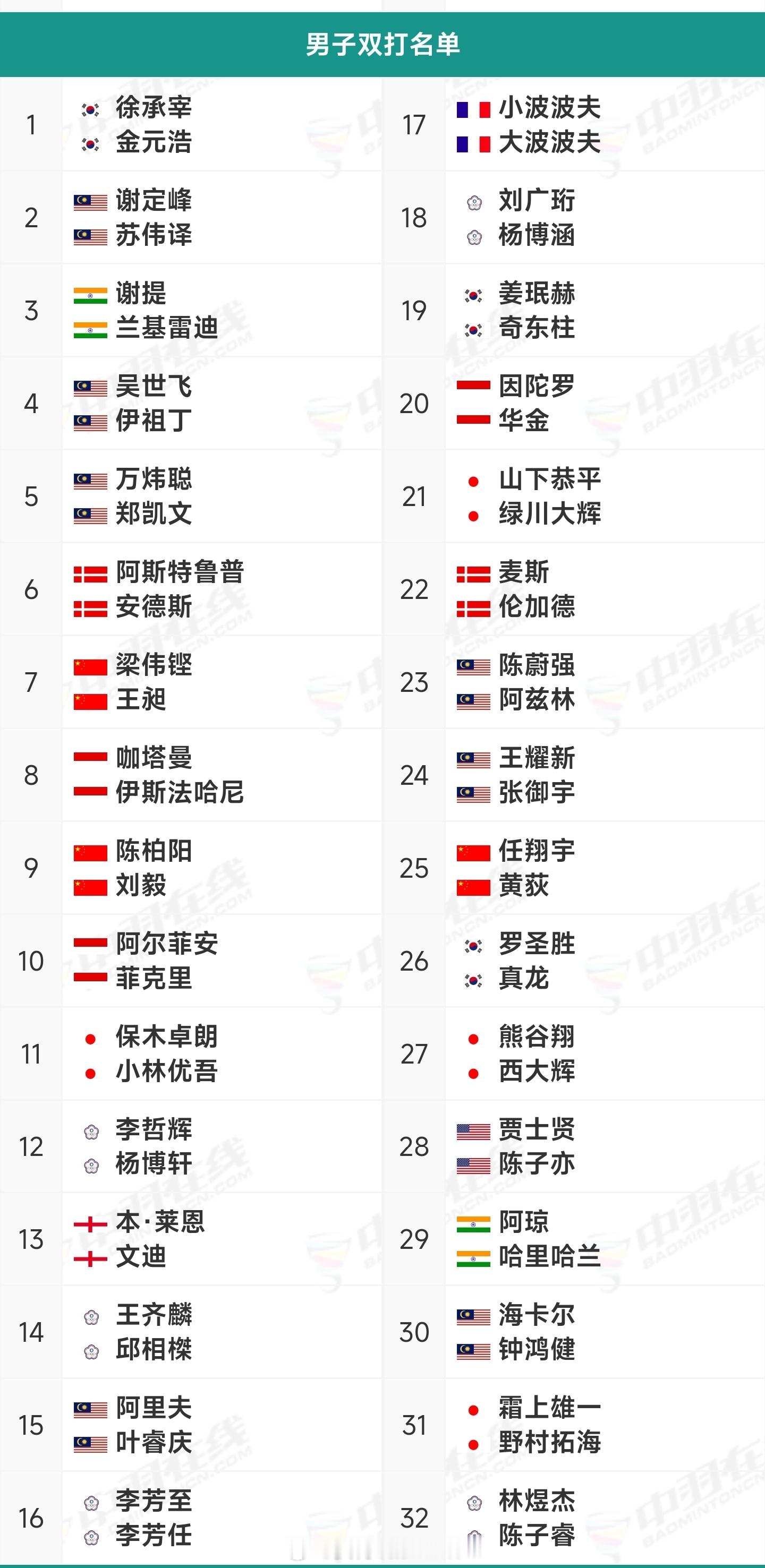 2026年马来西亚羽毛球公开赛比赛时间:1月6日-1月11日地点:马来西亚🇲🇾吉隆坡级别:超级1000冠亚积分:12000/10200⭐总奖金:145w美元💵国羽🇨🇳报名名单——Q为资格赛、R为替补🟣男单:石宇奇、李诗沣、翁泓阳、陆光祖、王正行🟣女单:王祉怡、韩悦、陈雨菲、高昉洁、韩千禧R4🟣男双:梁伟铿/王昶、陈柏阳/刘毅、⭐任翔宇/黄荻、⭐刘阳/陈旭君R2🟣女双:刘圣书/谭宁、贾一凡/张殊贤、⭐李怡婧/鲍骊婧、⭐罗徐敏/王漪朵🟣混双:蒋振邦/魏雅欣、冯彦哲/黄东萍、郭新娃/陈芳卉、程星/张驰羽毛球2026年世界羽联巡回赛
