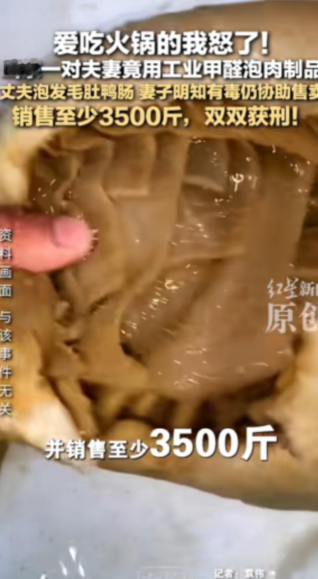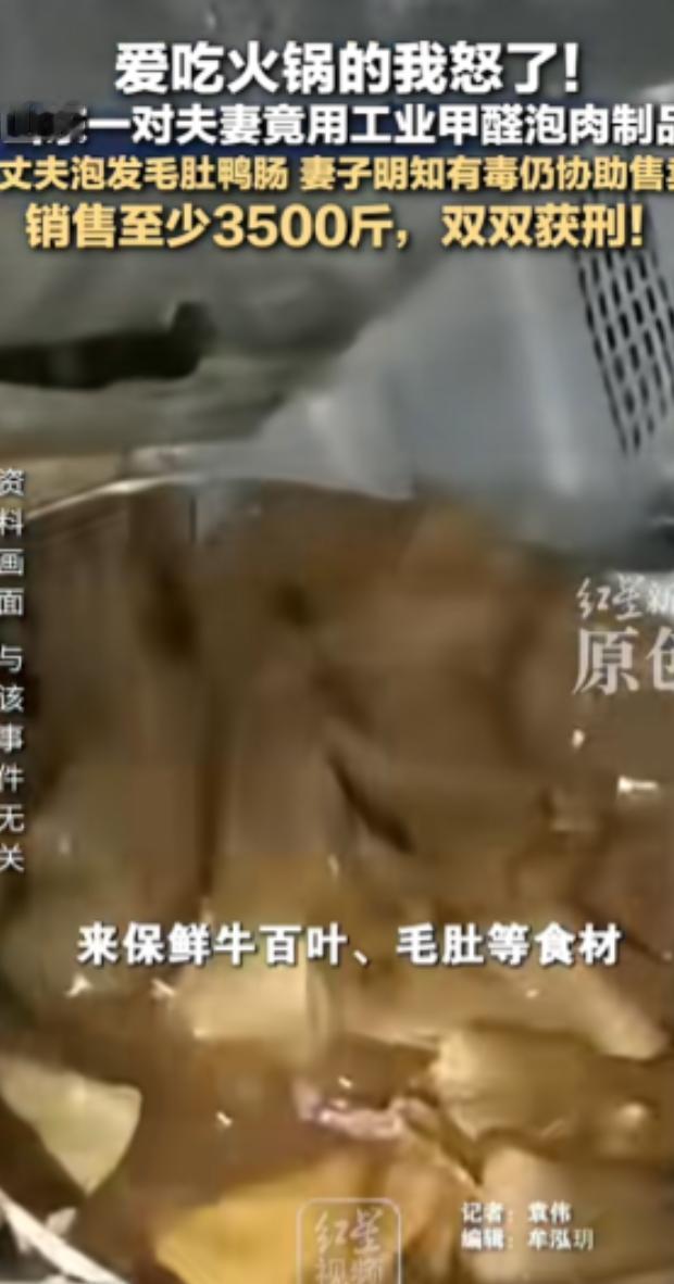“太可怕了!”山东东营,一男子为了让肉制品卖相更好,不易变质,竟然使用工业甲醛泡发食材,他的妻子虽然知道内情,但仍帮助售卖,4年来,至少卖出3500斤“毒食材”,最终双双获刑。网友:爱吃火锅的我怒了! 这事儿的主角叫李某甲,在东营做生鲜生意,主要卖毛肚、鸭肠、牛心管这些火锅常用的食材,2020 年刚开始做的时候,他还算是按规矩来,可做生鲜最怕的就是损耗,尤其是到了夏天,高温天里这些内脏类食材特别容易变质,一旦卖相变差就没人愿意买,只能白白扔掉,看着不少快要变质的食材,李某甲心疼钱就动了歪心思。 他知道普通的食用碱泡发虽然合规,但保鲜时间短,也没法让变质的食材 “起死回生”,于是他把主意打到了工业甲醛上,这种东西常用于工业防腐,不仅能让食材长时间不变质,还能让原本发蔫、颜色暗沉的毛肚、鸭肠变得鲜亮硬挺,看起来跟新鲜的上等货没两样,虽然他明知道甲醛是国家明令禁止添加在食品里的,对人体危害极大,但为了赚钱,还是铤而走险。 从那以后,李某甲的操作间里就多了刺鼻的化工味。那些本该被丢弃的变质食材下脚料,被他放进装满甲醛溶液的池子里浸泡,泡完之后摇身一变,就成了货架上 “新鲜诱人” 的热销品,而他的妻子朱某,自始至终都知道丈夫在食材里加了工业甲醛,可她没有阻止反而选择了同流合污,帮着丈夫打包这些 “毒食材”,然后分销到市场上,卖给不知情的商家和食客。 这对夫妻就靠着这种黑心生意,整整做了 4 年,4 年里他们源源不断地把浸泡过甲醛的毛肚、鸭肠、牛心管等食材推向市场,累计销量至少有 3500 斤。 想想看这 4 年里有多少人在火锅店、家里,开开心心地涮着这些 “毒食材”,把工业化学品吃进肚子里,光是想想就让人头皮发麻。 好在天网恢恢疏而不漏,今年 9 月 13 日,东营公安分局的执法人员在工作排查中,察觉到了李某甲生意的异常,很快就锁定了线索,仅仅过了 11 天,警方就正式立案侦查,面对严密的调查,李某甲夫妇那些 “查不到我”“加一点没事” 的侥幸心理彻底崩塌了。 10 月 9 日在接到警方的电话通知后,这对夫妻主动到案面对审讯,他们也如实供述了自己用甲醛泡发食材并销售的罪行,还向法院提供了罚金担保。 执法人员在他们的藏身之处进行搜查时,查获了大量证据,在西苑水产市场的一处室内,堆放着 17.1 公斤的生毛肚、23.1 公斤的鸭肠,还有几公斤的牛心管和猪心管,另一处冷库里,更是封存着近 20 公斤的生毛肚、20 多公斤的生鸭肠,以及重达 32.94 公斤的生牛心管,这些等待流向餐桌的 “定时炸弹” 加起来足有一百多公斤。 11 月 20 日法院对这起案件作出了判决,虽然李某甲夫妇有自首情节也认罪认罚,但食品安全是底线,绝对不能践踏,主导作案的李某甲,因犯生产、销售有毒、有害食品罪,被判处有期徒刑二年,还得缴纳 8 万元罚金,而明知食材有毒仍协助销售的妻子朱某,作为从犯,被判处有期徒刑一年,缓刑一年,同时缴纳 2 万元罚金,这一纸判决终于终结了他们沾满化工药剂的黑心生意。 消息传开后网友们炸开了锅,尤其是爱吃火锅的网友,更是怒不可遏:“太恶心了!以后吃火锅都有阴影了!”“为了赚钱连良心都不要了,甲醛吃多了对身体伤害多大啊!”“判得好!就该严惩这种黑心商贩,守护我们的餐桌安全!” 食品安全大于天任何时候都不能为了利益触碰法律红线,同时也提醒大家,平时在外吃饭或者买生鲜食材,一定要选择正规的商家和市场,多留个心眼,毕竟我们吃进嘴里的每一口食物,都关系到身体健康,绝对不能让黑心商贩有可乘之机。 (《爱吃火锅的我怒了!山东一对夫妻竟用工业甲醛泡肉制品丈夫泡发毛肚鸭肠 妻子明知有毒仍协助售卖销售至少3500斤,双双获刑!》红星新闻)