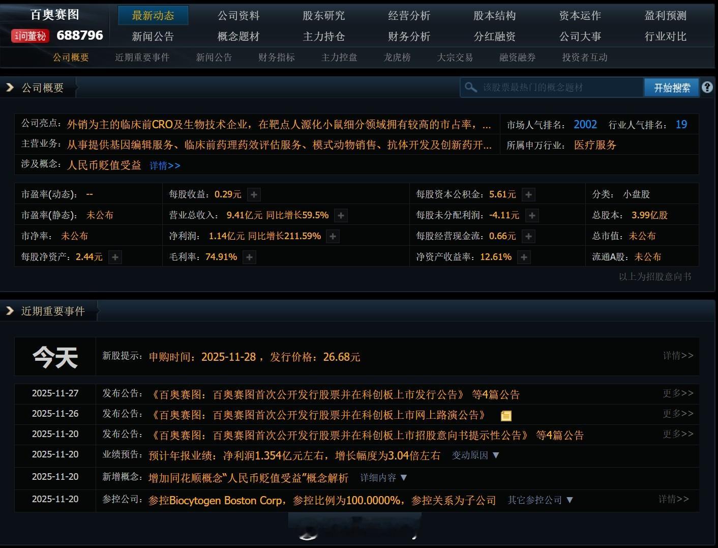 【11月28日新股申购】1只申购百奥赛图 从事提供基因编辑服务、临床前药理药效评估服务、模式动物销售、抗体开发及创新药开发,是外销为主的临床前CRO及生物技术企业,在靶点人源化小鼠细分领域拥有较高的市占率,自研的全人抗体小鼠平台RenMab为目前全球已知的人源化程度最高的小鼠平台之一。 券商观点:正常申购。猫说新股