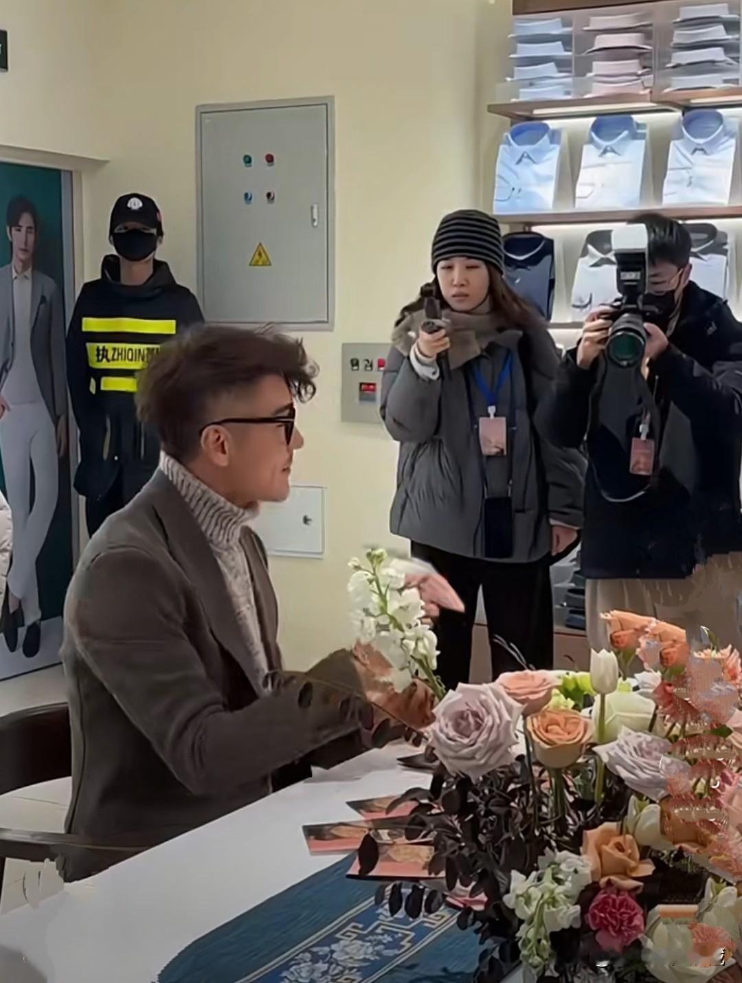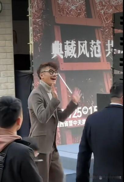 胡军在山西晋城出席活动,紧身小西装,高领毛衣,卷曲微黄的头发,帅气有型,举手投足
