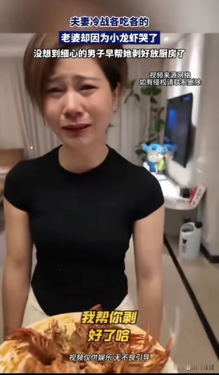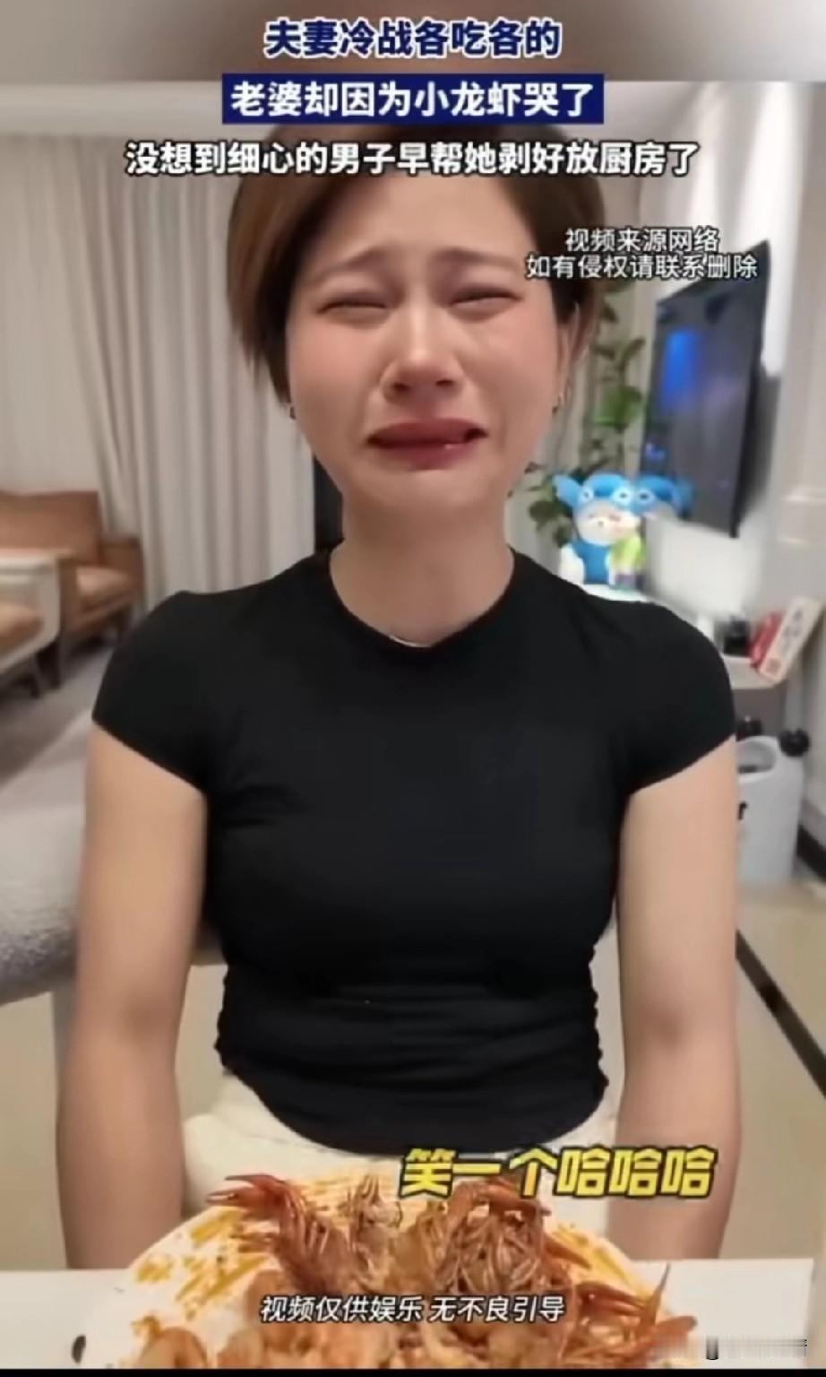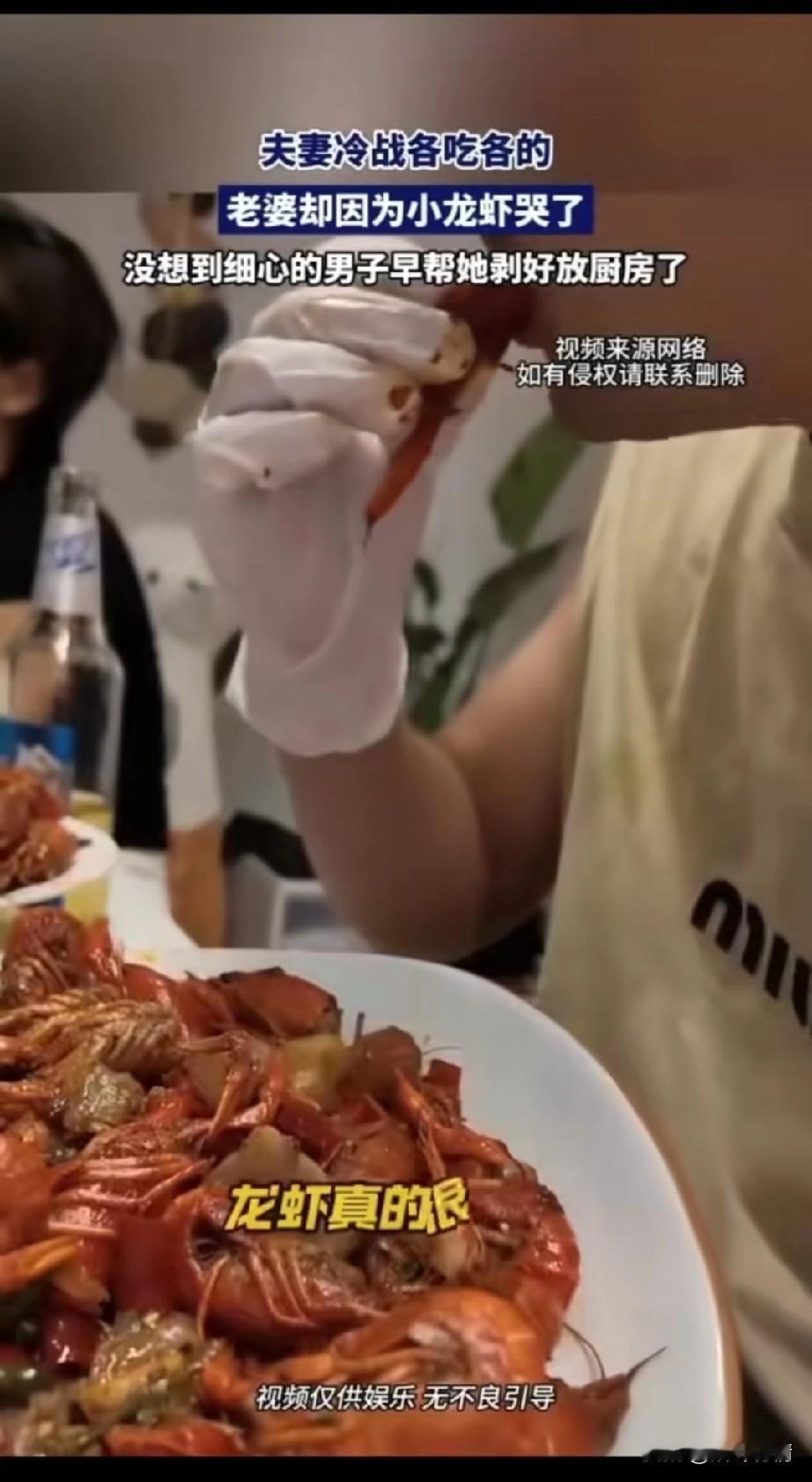 夫妻之间冷战, 表是各吃各的, 男子买了小龙虾, 喝着啤酒吃着小龙虾开心极了, 妻子只能在旁边看着, 不一会就伤心的哭了, 对着老公说道:“你怎么那么自私?” 没想到细心的男子, 早就给妻子剥好了, 只是放在了厨房, 看到妻子被气哭了, 就从厨房将剥好的虾端了出来, 还说早就给你准备好了, 让自己的妻子笑一个, 伤心的妻子哭得更伤心了, 都说爱笑的女孩运气不会差, 我看这爱哭的妻子运气也不差, 大家对于夫妻双方吵架怎么看? 夫妻吵架感悟 夫妻间吵架 婚姻家庭冷战 家庭冷战 两口子吵架日记 夫妻怄气 爱情冷战