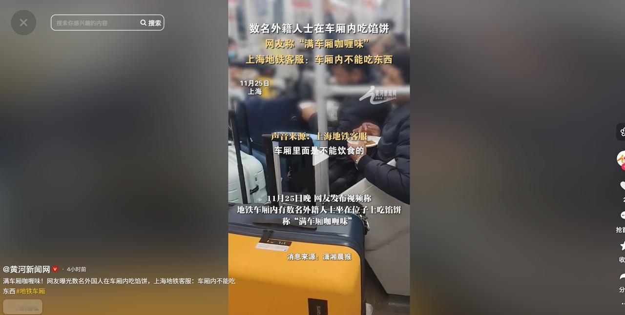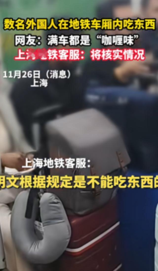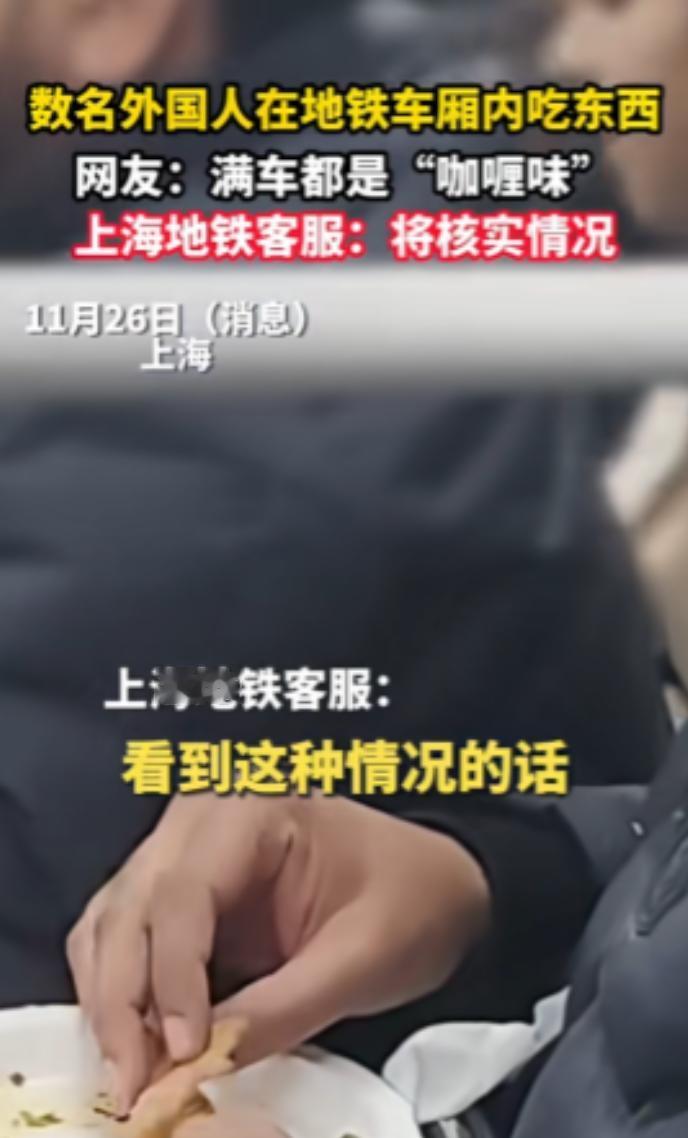 滚回自己的国家!近日,上海,地铁上出现一群外籍人士,他们竟然在车厢内拿着盘子吃起了手抓咖喱饭!周围的空气瞬间弥漫着难闻的味道,旁边的乘客只能捂紧自己的口鼻,不满地看着他们。网友:太没素质了! 11 月 26 号早上,上海的早高峰一如既往地紧张,地铁车厢里人挤人,空气流通本就不好,每个人都想着赶紧到站,开启一天的工作,就在这样拥挤又压抑的环境里,几个外籍面孔的乘客却显得格外 “惬意”,他们手里端着盘子,里面装着咖喱饭和咖喱馅饼,旁若无人地吃了起来。 咖喱这东西在餐厅里吃着香,可在密闭的地铁车厢里,那股霸道的辛香气味简直穿透力十足,更让人不适的是,他们直接用手抓取食物往嘴里送,手上沾着黄糊糊的酱汁,动作做得自然又流畅,还时不时互相递着分享,完全没顾及周围人的感受,地铁车厢轻微晃动,酱汁的味道混着食物的气味,迅速弥漫到整个空间,连角落都没能幸免。 周围的乘客可遭了罪,本来就被挤得退无可退,现在又被这刺鼻的气味包围,只能纷纷皱紧眉头,下意识地用手或者袖口捂住鼻子,有的人甚至把头扭向车窗,尽量避开气味来源。 有几个对气味特别敏感的乘客,被熏得头晕恶心脸色都变了,可看着那几位吃得津津有味、毫无波澜的外籍人士,也只能默默侧身避让,没人敢轻易上前劝阻。 有乘客实在看不下去,就把这一幕拍了下来发到网上,视频一经发布,评论区瞬间炸开了锅,满是愤怒的声音。很多每天赶地铁的打工人感同身受:“早高峰地铁挤得喘不过气,我们连大口喝水都不敢,生怕影响别人,他们倒好直接在车厢里吃咖喱饭,气味飘得到处都是,也太没素质了!” “公共场合讲点公德心行不行?这种刺激性气味谁受得了,完全不顾及别人的感受!” 还有网友气得直言 “滚回自己的国家!”,虽然语气激烈但也能看出大家的愤怒值有多高。 当然也有少数人微弱地辩解,说可能是他们不了解上海地铁的规则,或者是 “文化差异”,用手吃饭是他们的习俗,不该过分苛责,可这种说法很快就被反驳了:“文化差异也不能凌驾于公共规则之上吧?不管哪个国家,公共交通工具都是大家共用的空间,不能只顾着自己舒服。”“入乡随俗不是说说而已,既然来上海生活或者旅游,就得遵守这里的公共规则,这是最基本的尊重。” 其实《上海市轨道交通乘客守则》里写得明明白白,车厢内禁止饮食,之所以有这样的规定,就是为了防止食物气味扰人、汤汁洒漏弄脏车厢,影响所有人的出行体验。规则面前人人平等,不管是本地居民还是外籍访客,都得遵守,没有特殊待遇。所谓的 “文化差异”,不能成为破坏公共秩序的借口,公共素养不分国籍,尊重他人和遵守规则,才是通用的 “礼仪”。 让人觉得遗憾的是,这起 “车厢野餐” 闹剧持续了一路,全程都没有地铁工作人员出现制止,事后上海地铁回应说,当时车厢处于无人巡视的空档期,监管出现了疏漏,才让这种违规行为得以发生,这也提醒大家以后再遇到类似情况,不用默默忍受直接找车站工作人员或者打热线反馈,比自己憋一肚子气管用得多。 (信息来源:黄河新闻网)