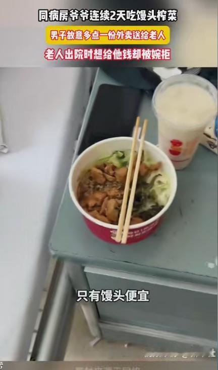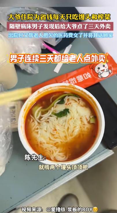 江苏一男子生病住院,见邻床老人只吃白馒头和榨菜,男子以为老人生病只能吃这个,没想到,次日,午饭时老人又再吃!得知原因后,男子给老人点了外卖,怕老人拒绝谎称多点了一份,接下来男子的做法令网友感动不已。   医院病房里,大多时候气氛都挺沉重的,可王先生(化名)却在这些细微的日常里,看到了别人藏在心里的难处,他住院的第三天,就注意到对床的中年老人,每顿饭都只吃白馒头配一碟榨菜,吃得还特别少。   一开始王先生以为是老人病情特殊,医生嘱咐要忌口,所以才吃得这么简单,直到有一次午饭时,老人见他一直看自己,才有些尴尬地解释了原因。   原来老人家里条件差,子女都在外地打工,他不想给孩子们添麻烦,住院的钱还是亲戚凑的,平时只能尽量省着花,白馒头最便宜,能填饱肚子就行。   王先生听完心里一紧,又心疼又犯难,直接掏钱给老人吧,怕伤了老人的自尊,人家说不定还不愿意接受,可要是不管不顾,自己心里又过意不去,总觉得良心不安。   从那以后,王先生就特别留意老人的一举一动,他发现每次护士或者护工给大家分饭,老人都会推辞着说 “够了够了”,偶尔接过额外的一份,也会放在一边不动,不知道是想留给谁,还是知道自己没能力回馈,干脆就不吃。   王先生琢磨了半天,决定换个方式帮老人,既不让他觉得没面子,又能让他吃点好的,先从一顿饭开始。   接下来的三天,王先生每天都在医院食堂点外卖,每次都特意多订一份,到了饭点,他拿着两份饭回到病房,临走时顺口跟老人说,今儿个不小心订多了,一个人也吃不完,你也一块儿吃点吧。   老人一开始还推辞,说不用不用,王先生就笑着把饭盒递过去,故意说自己酒量小,平时吃饭也少,医院的菜又不太合胃口,放着也是浪费,老人见他态度实在诚恳,没有一点施舍的意思,终于接过了饭盒。   看着老人狼吞虎咽的样子,王先生心里更不是滋味,可他没再多问一句关于钱的事,就怕戳到老人的痛处。   到了王先生出院那天,他特意将老人还没结清的医药账单,直接把这笔欠款给结了。 这事在病房里很快就被邻床的人传开了,大家都夸王先生做得好,既帮了人,又给老人留足了尊严,聪明又暖心,出院后,王先生也把这件事跟亲戚朋友说了,他没想着炫耀,就是希望更多人遇到需要帮忙的人时,能多想想办法,用更体面的方式伸出援手,别让受帮助的人当众难堪。 网友们看到这个故事,也纷纷留言,有人说 “这才是真正的善意,懂得替别人保留体面”,也有人说,希望能有更完善的社会救助渠道,别让老人因为好面子,就一直瞒着自己的困难。   其实这事儿的温度,就藏在那些细节里,不是大张旗鼓地施舍,而是悄无声息地体贴和尊重,王先生不过是多订了三天饭,结了一笔账,可对老人来说,换来的是一段日子的安心,还有做人的尊严。   也让旁边的人明白,平凡生活里的温情有多珍贵,要是社会上多一点这样的善意,那些藏在暗处的困难,就不会让一个人孤零零地扛着,也不会有人因为窘迫,活成一座孤岛。 对此,你还有什么看法呢?    (信息来源 :新华社 )