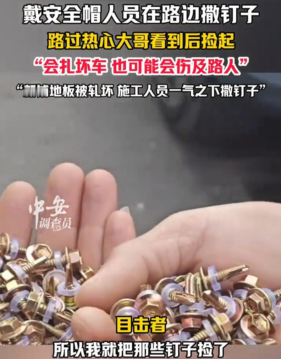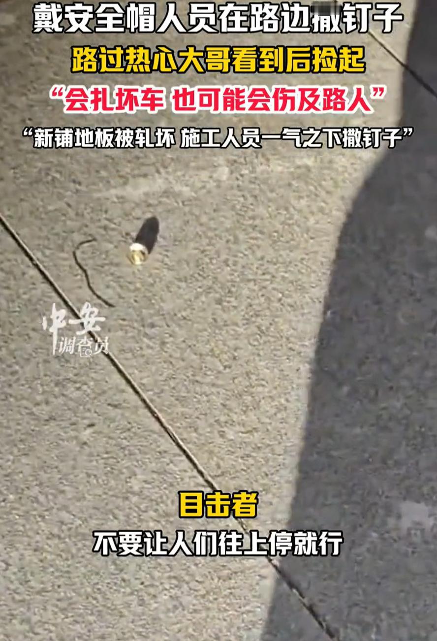 吵翻天!山西太原,一男子走路时发现一名戴安全帽人员在路边撒东西,一开始他还没明白对方在干什么,走近一看才发现竟然是往地上撒钉子,上前制止无果后,男子主动把钉子给捡了起来 男子介绍,那天他正走路经过一片小区施工路段,瞧见个戴安全帽的人站在路边,手里抓的竟是明晃晃的燕尾丝螺丝,专挑车底下扔 大哥赶紧上前阻拦,问对方为什么要这么做。施工人员也挺委屈,说这段路刚铺好,总有人乱停车,把新地面都压坏了,实在气不过才想出这招 听完解释,大哥心里很不是滋味。他理解施工方的心情,新铺的地面被乱停的车压坏,任谁都会恼火。可转念一想,撒钉子这办法实在欠妥。今天能扎破乱停的车胎,明天就可能扎穿路人孩子的鞋底 他试着和对方沟通,建议可以用放几个警示墩、拉条绳子之类的办法拦车。但施工人员似乎听不进去,依然我行我素 眼看劝说无效,大哥没再多争辩,而是蹲下身,默默把散落在地上的钉子一颗颗捡起来。他在那片区域来回搜寻,弓着腰忙活了好一阵,估计捡回了九成左右的螺丝 对此,网友们也是看法不一 有网友说:换位思考一下,为什么要这么做呢呢?还不是有些人乱停乱放 也有网友表示:施工可以选择围栏,可以设置警示牌,但撒钉子性质就不一样了 其实我觉得,撒钉子不是脾气大,是把责任往别人身上甩。施工方觉得自己吃亏,就想让乱停车的人吃亏,这是一种典型的反向报复心态。看着痛快,其实最不靠谱。路是公共空间,钉子一撒,风险就从“针对某辆车”变成“谁路过谁中招”,这跟堵心情绪不成正比 乱停车确实不对,但罚款是交警的事,不是施工人员的事。更重要的是,破坏公物责任明确,只要报备,有权依法追偿。现在很多施工单位其实都有摄像头,完全可以走取证程序,不需要靠撒钉子。施工人员的想法就是“我现在难受,我要对方也难受”,但这种思路只会把问题升级 施工人员当街撒钉子 热心人捡起
