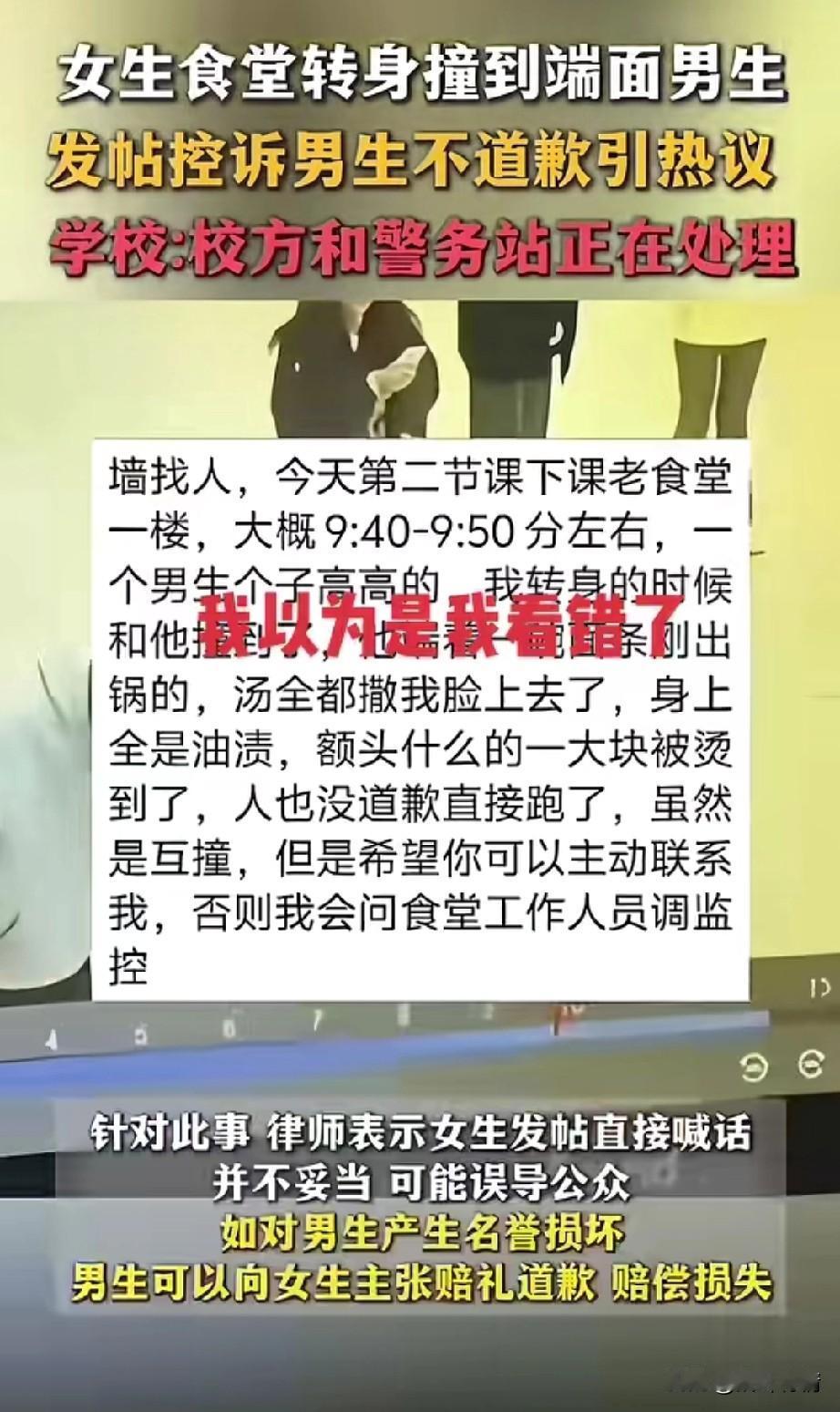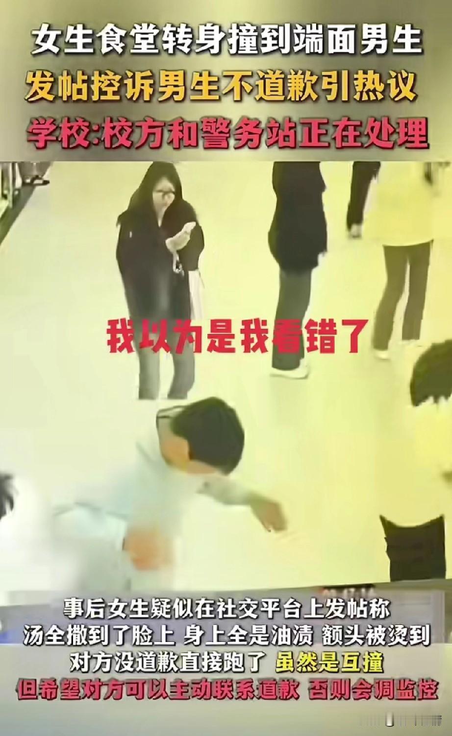 女生高校食堂走路不看路, 横向撞到了一位端面的男生, 汤汁撒了男生一身, 女生就像没事儿一样跑了, 头也不回一下, 本以为这事就这样过去了, 没想事后该女生在社交平台上, 发布了自己的小作文, 指责男生食堂端饭, 碰到了自己, 汤汁洒了她一头, 对方也没有给自己道歉, 希望学校会主动联系给她道歉, 不然她就会去查监控, 她的言论在网上引起了讨论, 在大家纷纷去声讨男生的时候, 学校放出了完整的监控, 这才让大家看到了女生的嘴脸, 还真是倒打一耙, 明明是女生撞到了男生, 女生事后逃跑了, 现在还在网上引导舆论网暴男生, 如今真相大白, 学校表示正在和警务站一起处理! 这年头曝光自己的女生还真少见! 大家对于学校该女生不承认错误还网暴男生怎么看? 女大学生 学院伤人事件 高校事故 食堂事故 大学生出事故