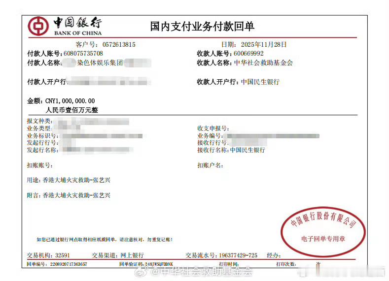今天委托染色体集团通过中华社会救助基金会捐赠人民币100万元,用于支援香港大埔火灾相关救援与受灾同胞的妥善安置。这个有爱心有社会责任感的张艺兴,对不幸遇难者表示沉痛哀悼,向受灾家庭致以深切慰问!同根同心,共担风雨,愿平安,香港加油! 张艺兴捐款驰援香港大埔火灾救援
