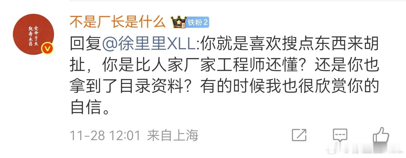 厂长的语气明显缓和了许多。“你就喜欢搜点东西来胡扯。”“你比厂家工程师还懂?”只要你不骂人,有礼貌,愿意虚心请教。遇到看不懂的东西,我还是愿意教的。我这人一贯秉持有教无类的原则。动物都能被培养成材,何况是人呢?