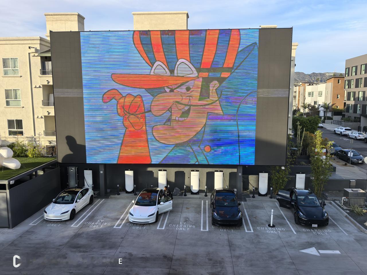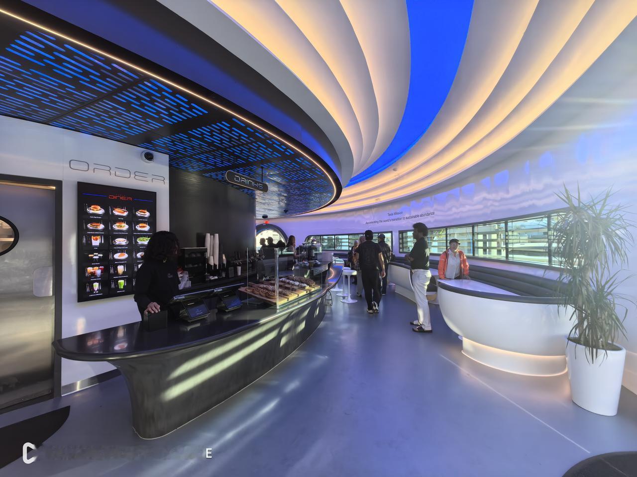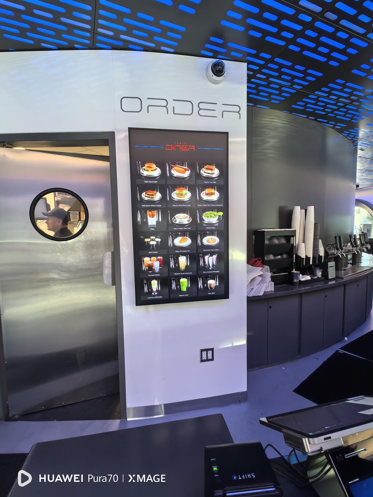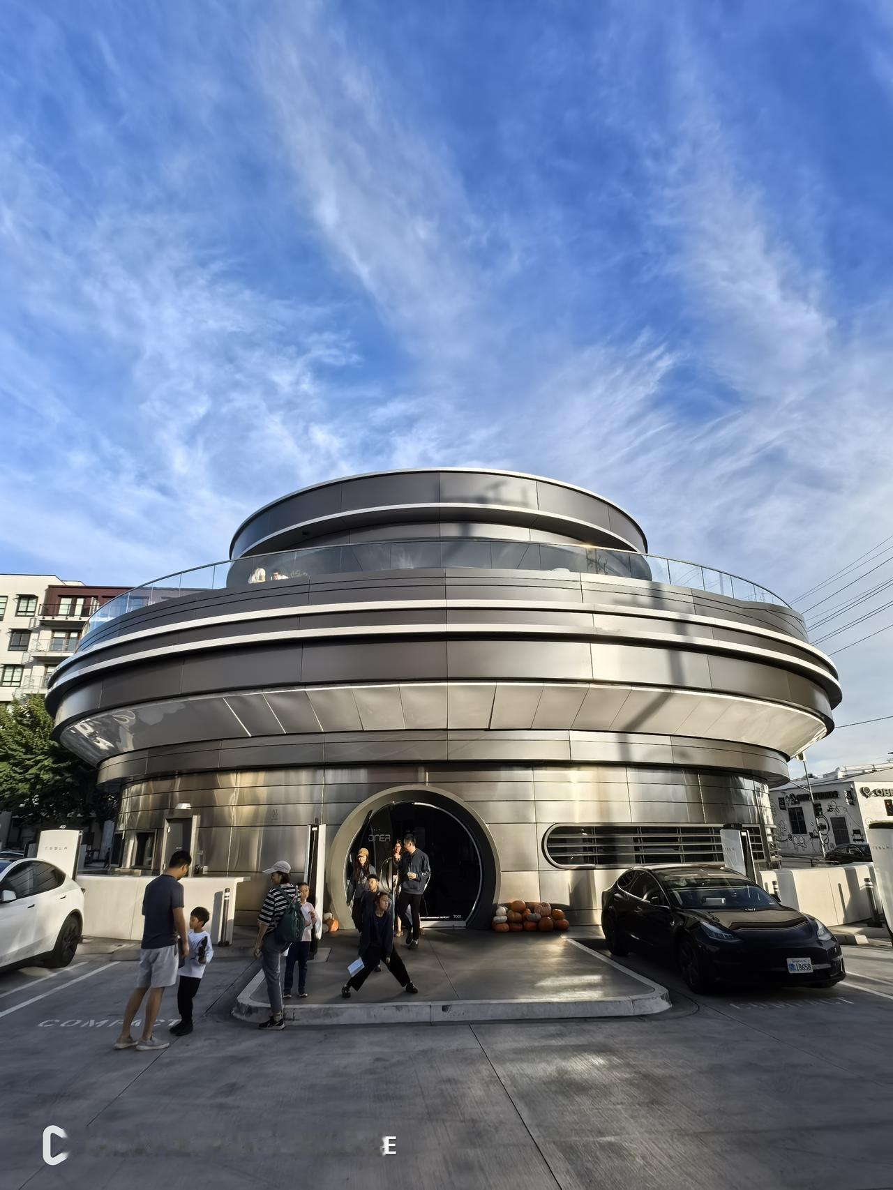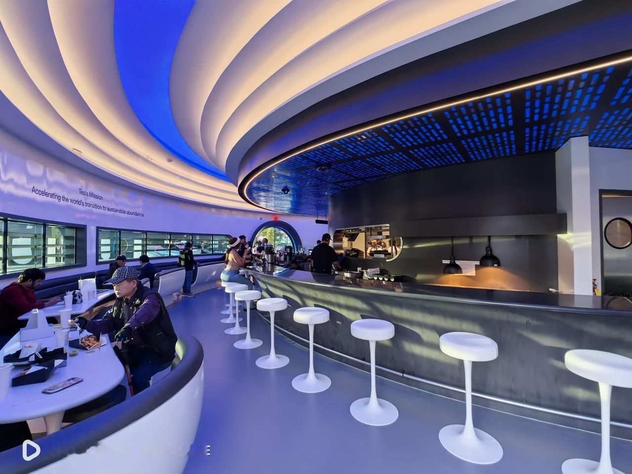 你绝对不知道,打卡全球唯一一家特斯拉餐厅是什么样的体验? 今天下午,我们在圣巴巴拉用完午餐,便开车前往洛杉矶。在酒店住下后,便前往格里菲斯天文台观看落日。由于我们开的是特斯拉,途中需要充电,找了两家都无空位,前往第三家的时候,竟然发现这里除了充电桩,还有目前全球唯一一家特斯拉餐厅(Tesla Diner),让我们很是好奇。 据了解,它是特斯拉在洛杉矶打造的,目前全球唯一一家融合美式复古餐厅、电动车超级充电站和露天汽车影院的创新空间。外观采用复古未来主义的太空飞碟造型,灵感来自上世纪五六十年代的美式汽车文化。在这里,可以一边给特斯拉充电,一边享用汉堡、奶昔等经典 diner 美食,还能在车内或户外座位区观看大屏电影。可以说,科技感和未来感满满。 我们在一楼点了两杯咖啡、热狗和甜点。坐在二楼,一边看露天电影,一边品尝美食。感觉挺好的,等充电的时间再也不会无聊了。 据说前一段时间刚开起来的时候,人满为患。需要排队等候40分钟才有座位,我们今天去运气还好,人不是很多。