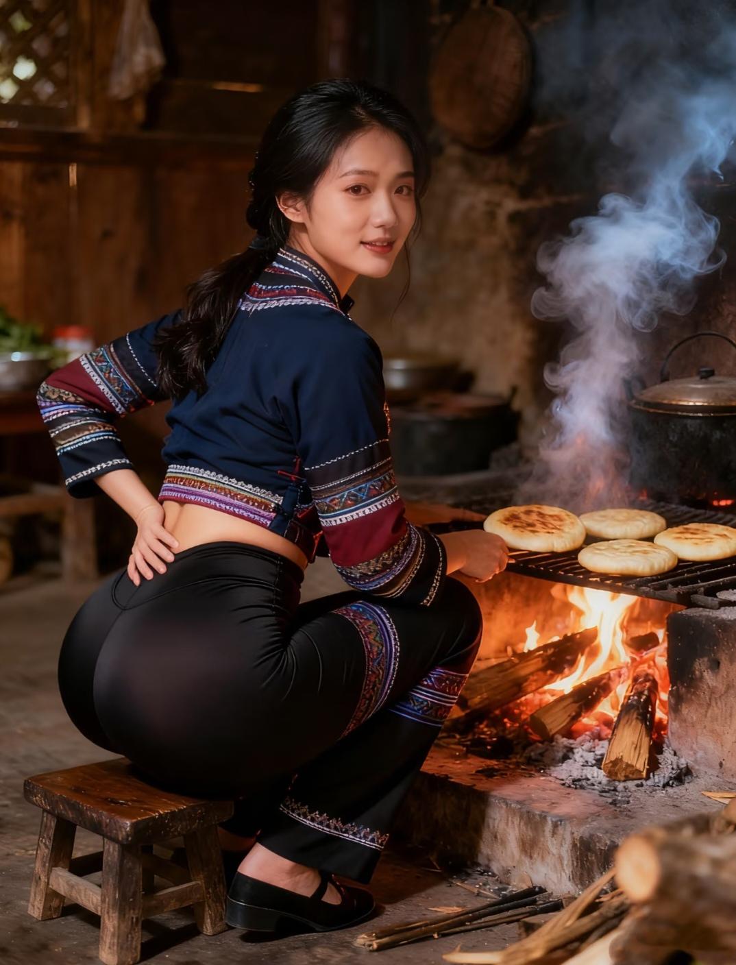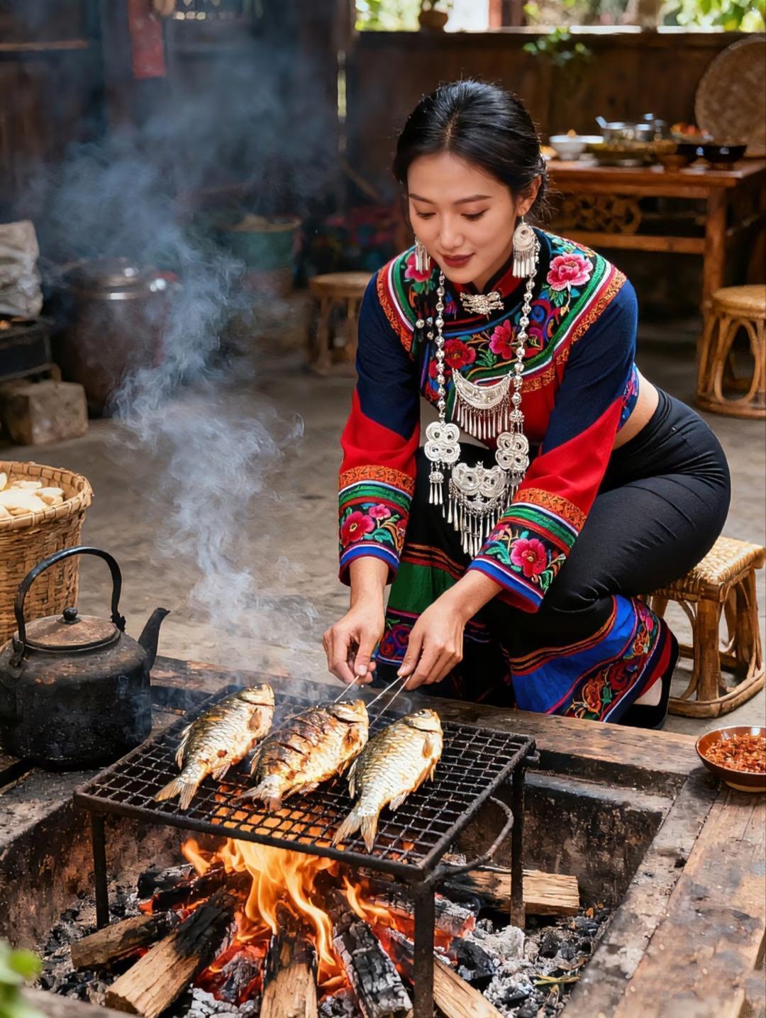 这三组充满烟火气息的镜头,生动展现了少数民族女性传承千年的烹饪智慧。火塘边专注烤肉的女子,炭火映照下泛着油光的肉块与墙上悬挂的辣椒玉米相映成趣;灶台前微笑烤饼的妇人,金黄酥脆的饼皮与质朴的厨房用具构成温馨画面;银饰叮当中翻转烤鱼的场景,跃动的火苗与竹篮木桌交织出浓郁的生活气息。每一帧都是对传统饮食文化的深情记录,炭火炙烤的不仅是食物,更是代代相传的生活艺术。从滋滋作响的烤肉到热气腾腾的烤饼,从金黄酥脆的烤鱼到墙上悬挂的丰收果实,这些画面完美诠释了"最是人间烟火气,能抚凡人心"的真谛。