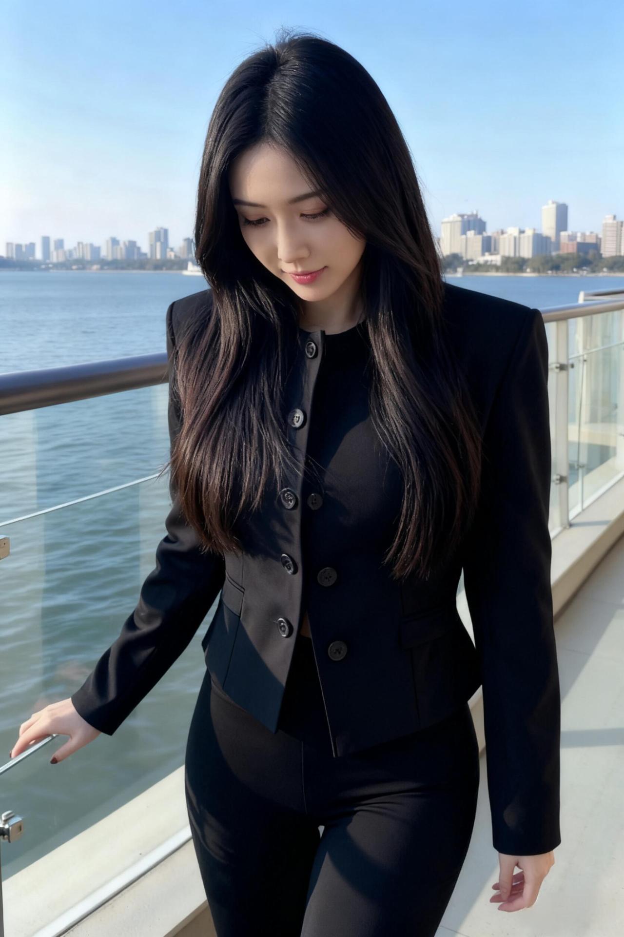 ||短款收腰西装+高弹紧身裤,又飒又辣还能藏住小肉肉~ 配双细跟鞋,站在江边露台