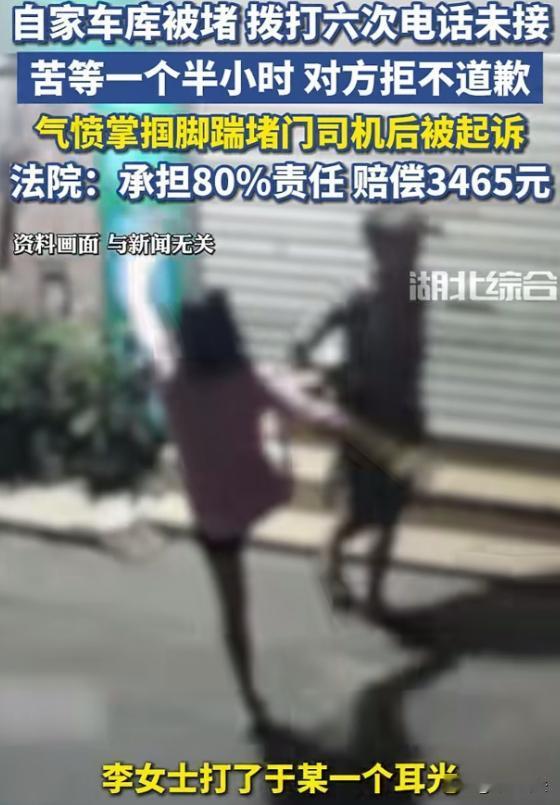 辽宁大连,李女士打算开车出门,到地下车库时,却发现自家车位被一辆车堵得严严实实。车里留有车主电话,李女士满心以为打个电话就能解决问题,于是赶忙拨打,可连打6个电话,对方都没接。心急如焚的李女士还有急事要办,实在没办法,只好找交警帮忙,这才联系上了车主于某。本以为联系上就能顺利挪车,可李女士又在车库苦等了一个多小时,于某才慢悠悠地过来。李女士要求于某道歉,没想到于某不仅不道歉,态度还十分嚣张,觉得李女士催他让他心烦,来了挪车就行,不该要求道歉。李女士气坏了,冲动之下踹了于某一脚,没想到这一脚给自己惹来了大麻烦。 2025年6月8日晚,李女士准备开车出门。 她来到地下车库,却看到自家车位被一辆车堵得严严实实,连自家车都开不进去。 李女士心想这可咋整,自己还有急事。 好在车里留有车主电话,李女士心里燃起一丝希望,赶紧掏出手机拨打。 嘟……嘟…… 电话那头一直没人接,李女士心里越来越着急,一个接一个地打,一连打了6个,对方始终没有回应。 李女士急得直跺脚,她还有重要的事情要办,时间可耽误不起。 实在没办法,她只好向交警求助。 在交警的帮助下,好不容易才联系上了车主于某。 李女士以为这下问题能解决了,可没想到,在车库里又苦等了一个多小时,于某才慢悠悠地出现。 李女士心里憋了一肚子气,堵车库门不说,还不接电话,让自己白白等了这么久,于是要求于某道歉。 可于某,不仅不道歉,态度还十分嚣张。 他觉得李女士一直催他,让他心里很烦躁,来了挪车就行了,还要求什么道歉。 自己好好地车位被堵,等了这么久,对方还这么没礼貌。 一时没忍住,冲动之下,李女士抬脚踹了于某一脚。 于某顺势倒在地上,还报了警,说自己被打了。 民警赶到后,了解了事情的经过。 最终,李女士因为殴打他人,被拘留了3日。 这还不算完,于某还把李女士告上了法庭,要求她赔偿。 根据《民法典》第一千一百六十五条规定,行为人因过错侵害他人民事权益造成损害的,应当承担侵权责任。 李女士因为于某堵车、不接电话、迟到不道歉这些事,一时冲动踹了于某,这明显是侵害了于某的身体权,存在过错,所以得承担侵权责任。 于某堵车库门,让李女士没法停车,还不接电话,让李女士干着急,迟到后态度还嚣张拒绝道歉,这些行为虽然不违法,但确实不道德,也是引发矛盾的诱因,存在一定过错。 最终,法院经过审理,判决李女士承担80%的责任,赔偿于某3465元。 这个结果让李女士气得不轻,她觉得自己太委屈了。 法院这么判,既否定了李女士以暴制错的行为,毕竟动手打人是不对的,不管啥原因都不能成为打人的理由。 同时也考量了双方的过错程度,让有过错的于某也承担一部分责任。 遇到事儿得冷静,不能冲动,得通过合法合理的途径去解决问题,不然最后吃亏的可能是自己。