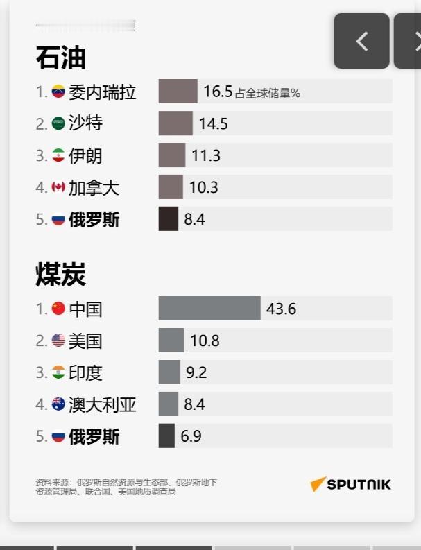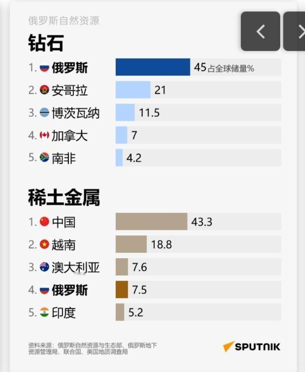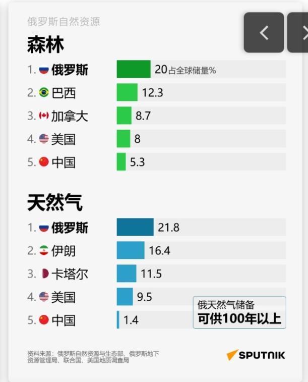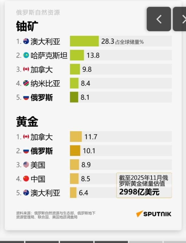 约占全球20%?!大俄自然资源储量真是令人垂涎呀,难怪老美和欧公子总给它找茬。看附图,黄金、钻石、铁矿石、石油、天然气、稀土、煤炭、铀…… 据俄罗斯卫星通讯社11月27日报道,俄罗斯自然资源储量居世界首位,是美国的两倍,总估值约100万亿美元——约占全球的20%。 重要的品类它几乎全都有啊,而且储量都是全世界排名前几名那种,太令人羡慕了。大俄人少地广,资源多,如果它开发得好,光卖这些资源都足以暴富了! 从自然资源储量这点也可以看出,大俄的战争潜力确实非同小可。如果没有老美出手,欧公子和小乌还真干不过它。大俄的枪杆子硬,家里山货多,打缺钱了,人家大不了就便宜甩卖一部分来换钱,血条又立马恢复不少。就这一手,欧公子和小乌怎么破嘛,简直无解呀!