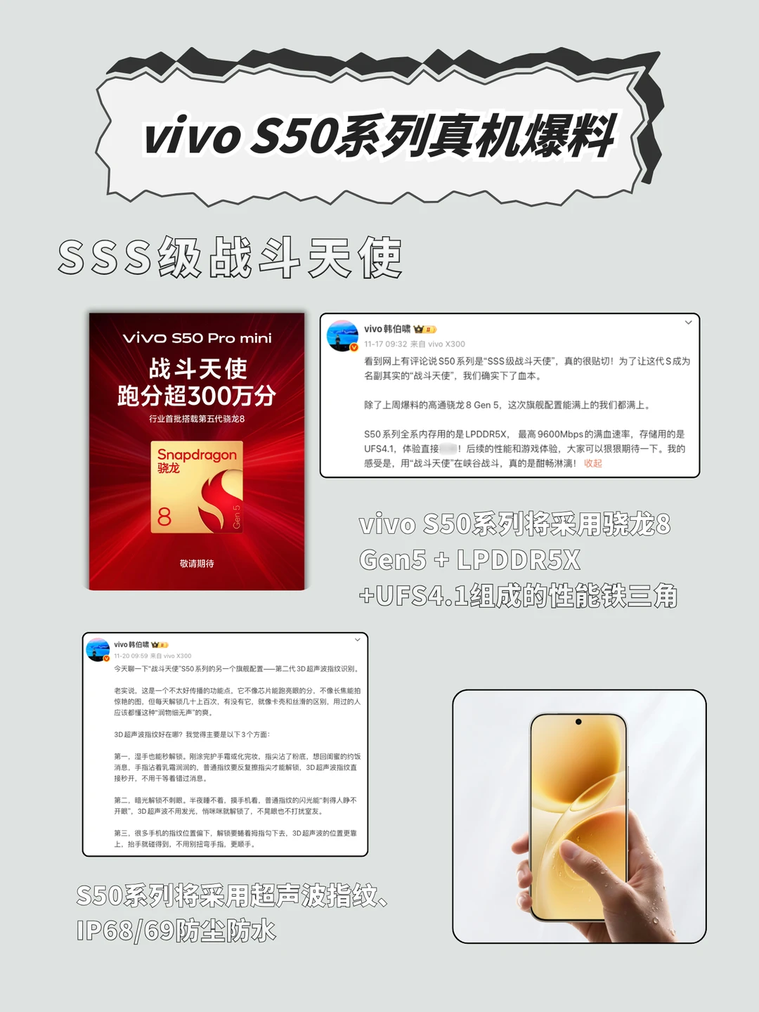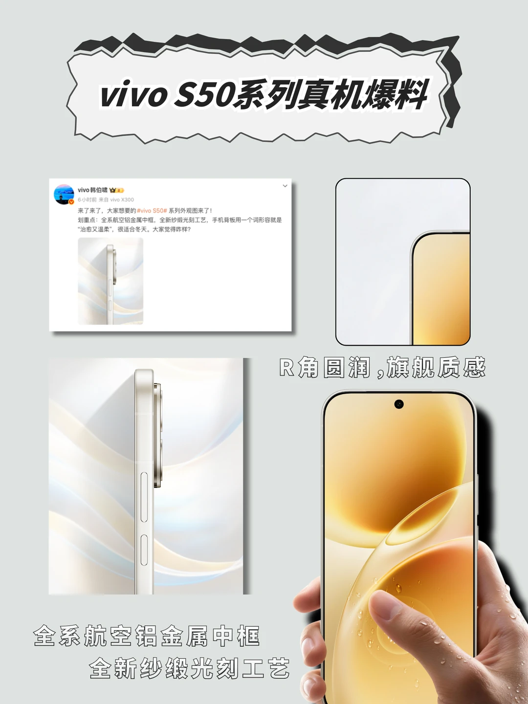田曦薇手持vivo S50真机图曝光!这波未发先火的操作,直接把对vivo S50的期待值拉高~ 第一眼就被外观戳中:金属中框+细腻雾面背板,搭配恰到好处的圆润弧度,不仅颜值高级耐看,上手质感更是媲美旗舰!拿在手里不厚重、不滑手,日常单手握持毫无压力,颜值党和实用党都能满足~ 核心配置更是诚意爆棚:骁龙8 Gen5旗舰处理器加持,搭配LPDDR5X+UFS4.1满血组合,不管是多任务切换还是大型游戏,都能体验丝滑流畅的操作;影像方面堪称“移动摄影棚”,IMX9系主摄+大底潜望长焦,加上主打的“长焦live神器”功能,动态抓拍、远景变焦都能轻松拿捏,随手一拍就是质感大片~ 更有超声波指纹、IP68/69防水等旗舰级细节配置,6.31/6.59英寸双尺寸可选,年底换机纠结党? vivo S50这波闭眼冲就对了!