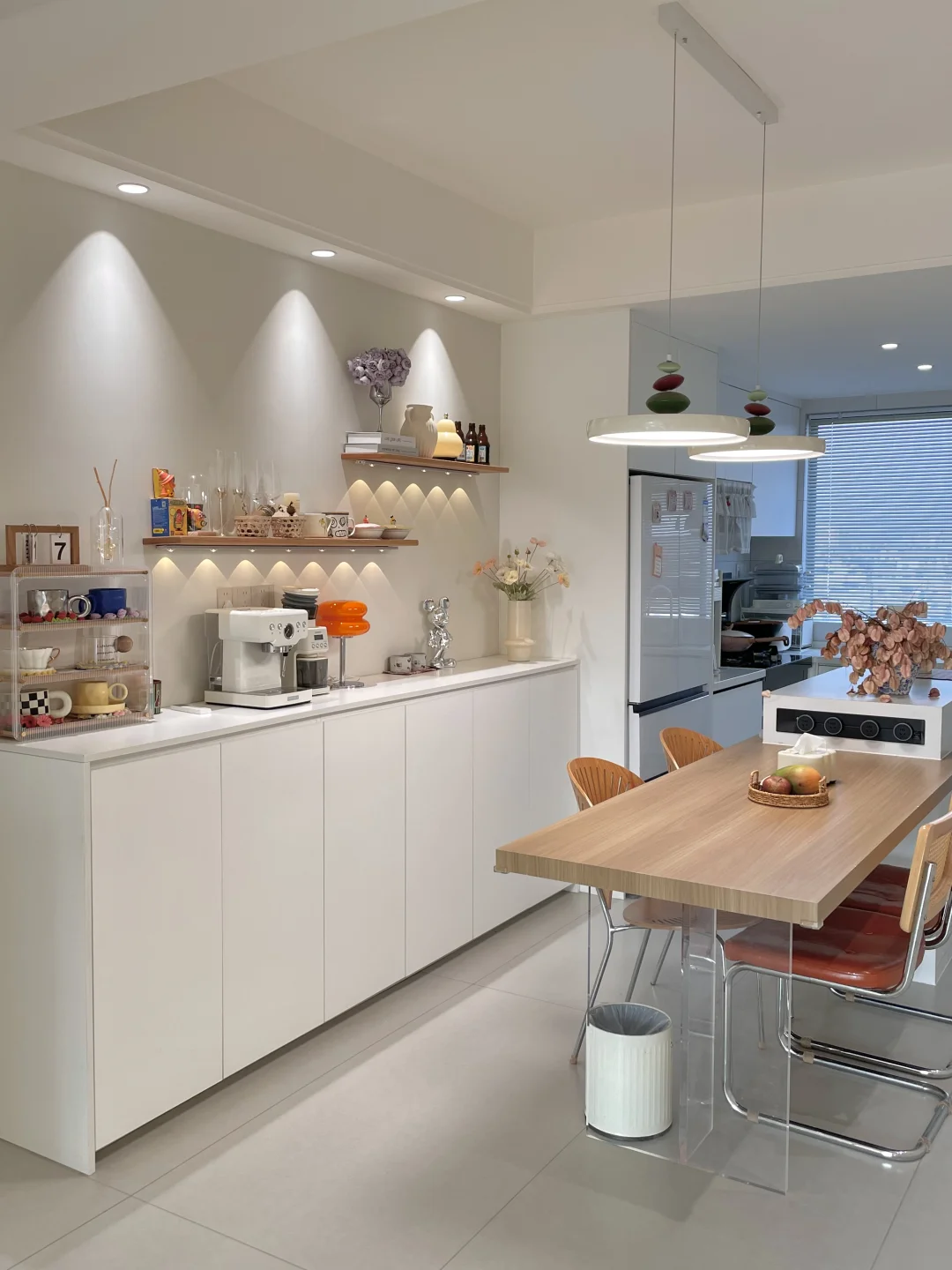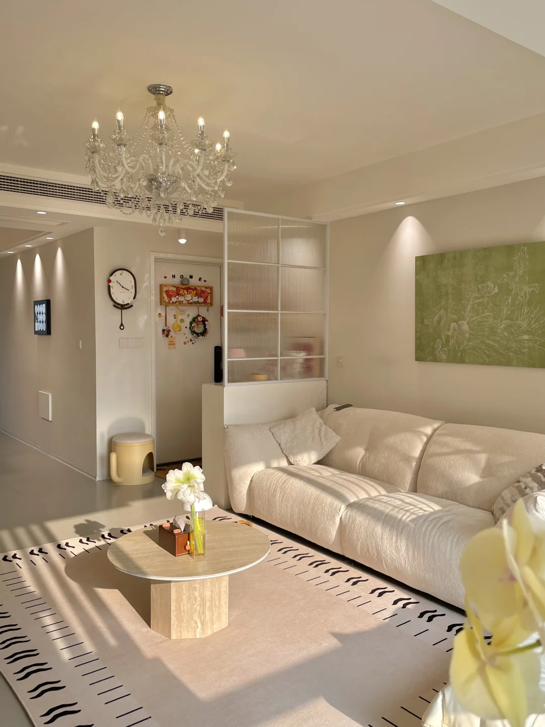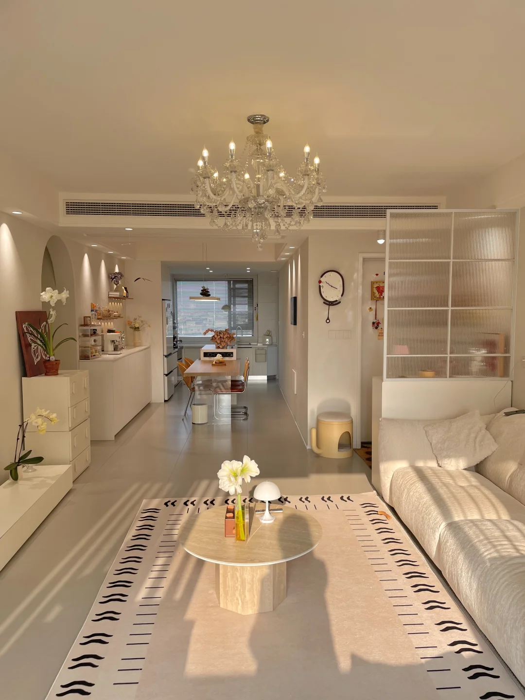 我家建面128平,套内只有104平 朋友来我家都说你家看起来,真的显大又通透 1️⃣打通阳台隔断和厨房隔断,让客厅、餐厅、厨房融为一体,视野开阔不少 2️⃣全屋以奶白色和浅灰色,作为色调,搭配一些原木色系,简单又温馨,还能在视觉上放大空间 3️⃣入户用玻璃隔断代替实体墙,划分空间的同时还能保持通透感! 自己设计的小家,虽然不豪华,但是简单温馨