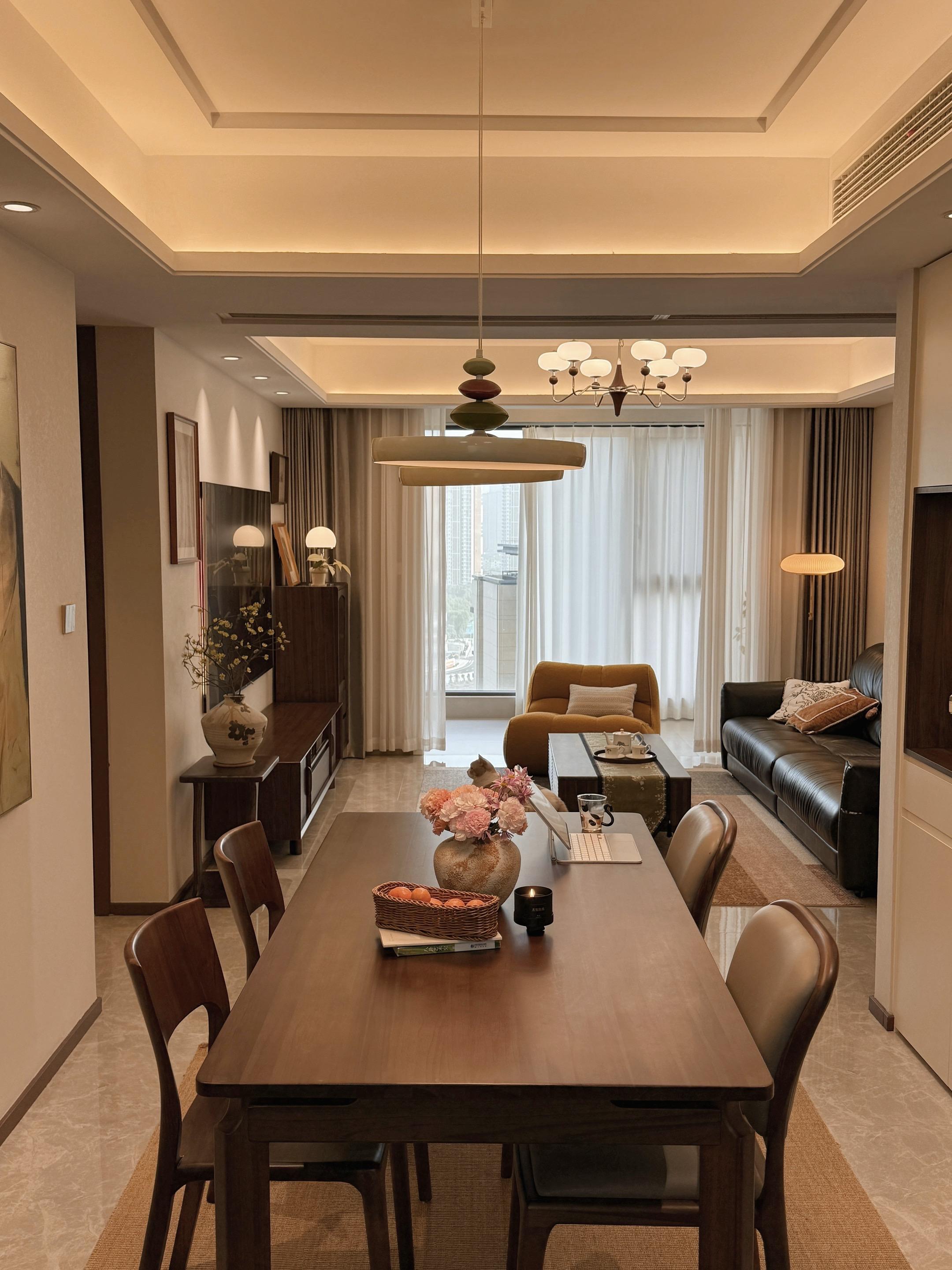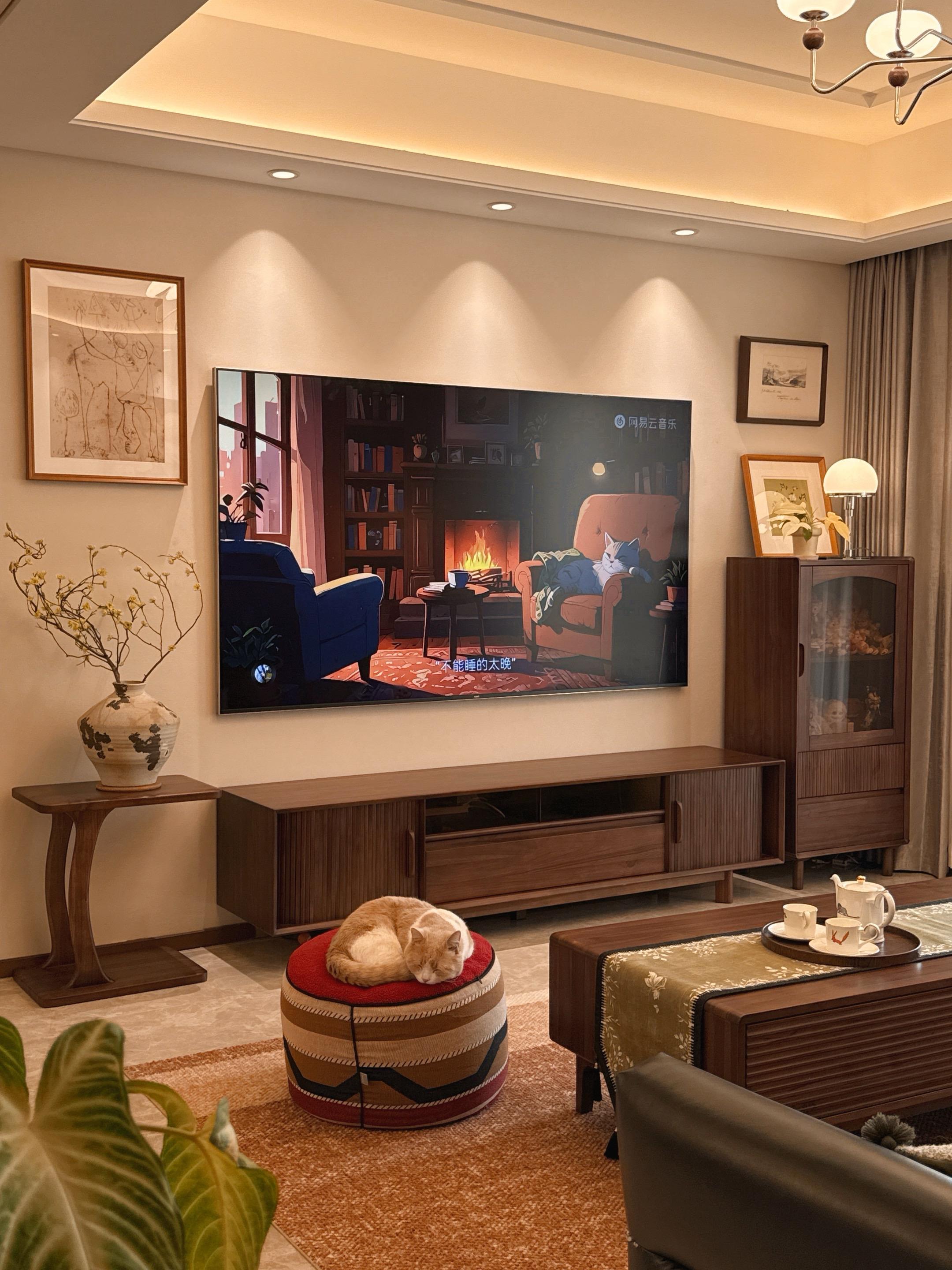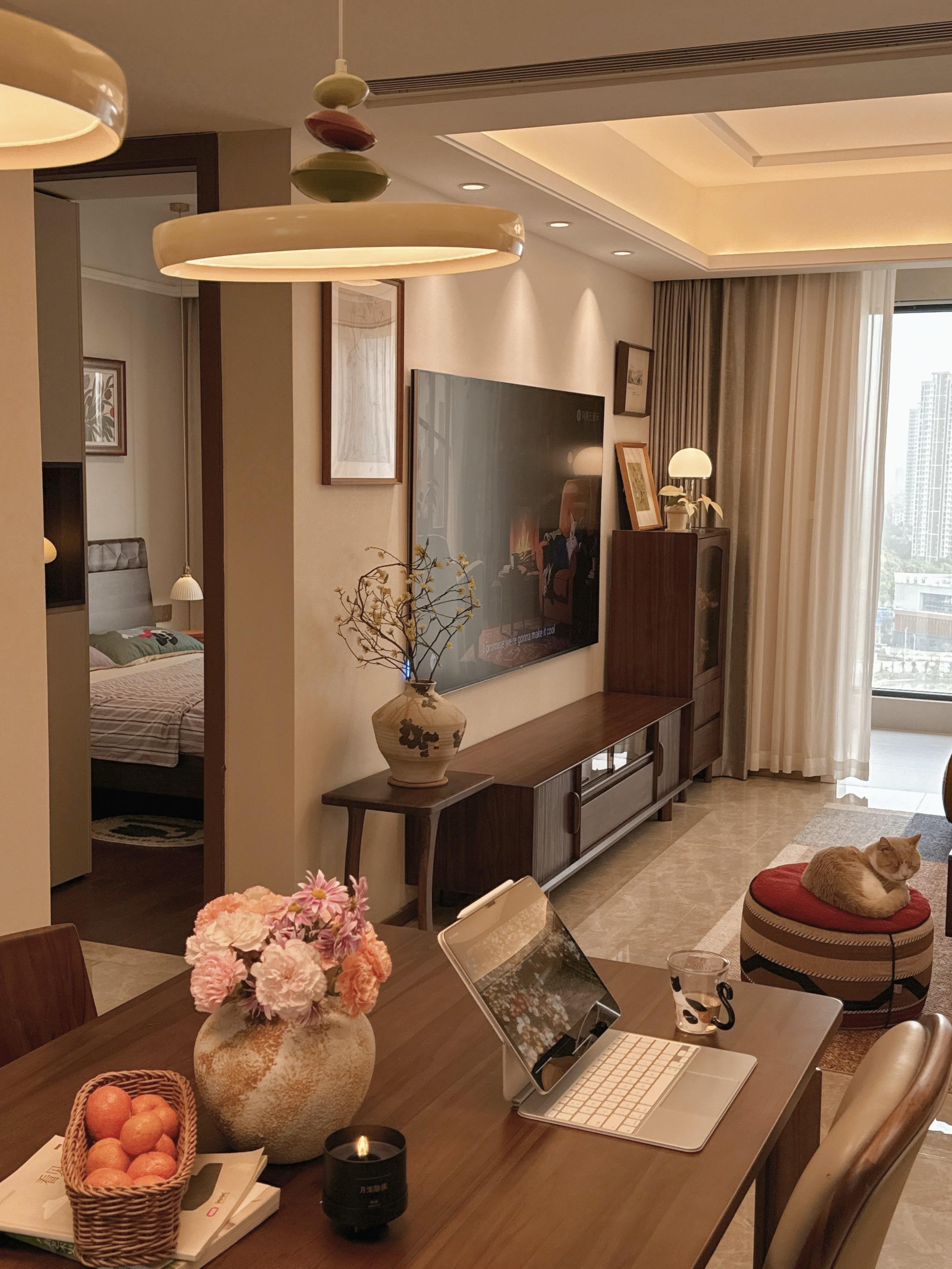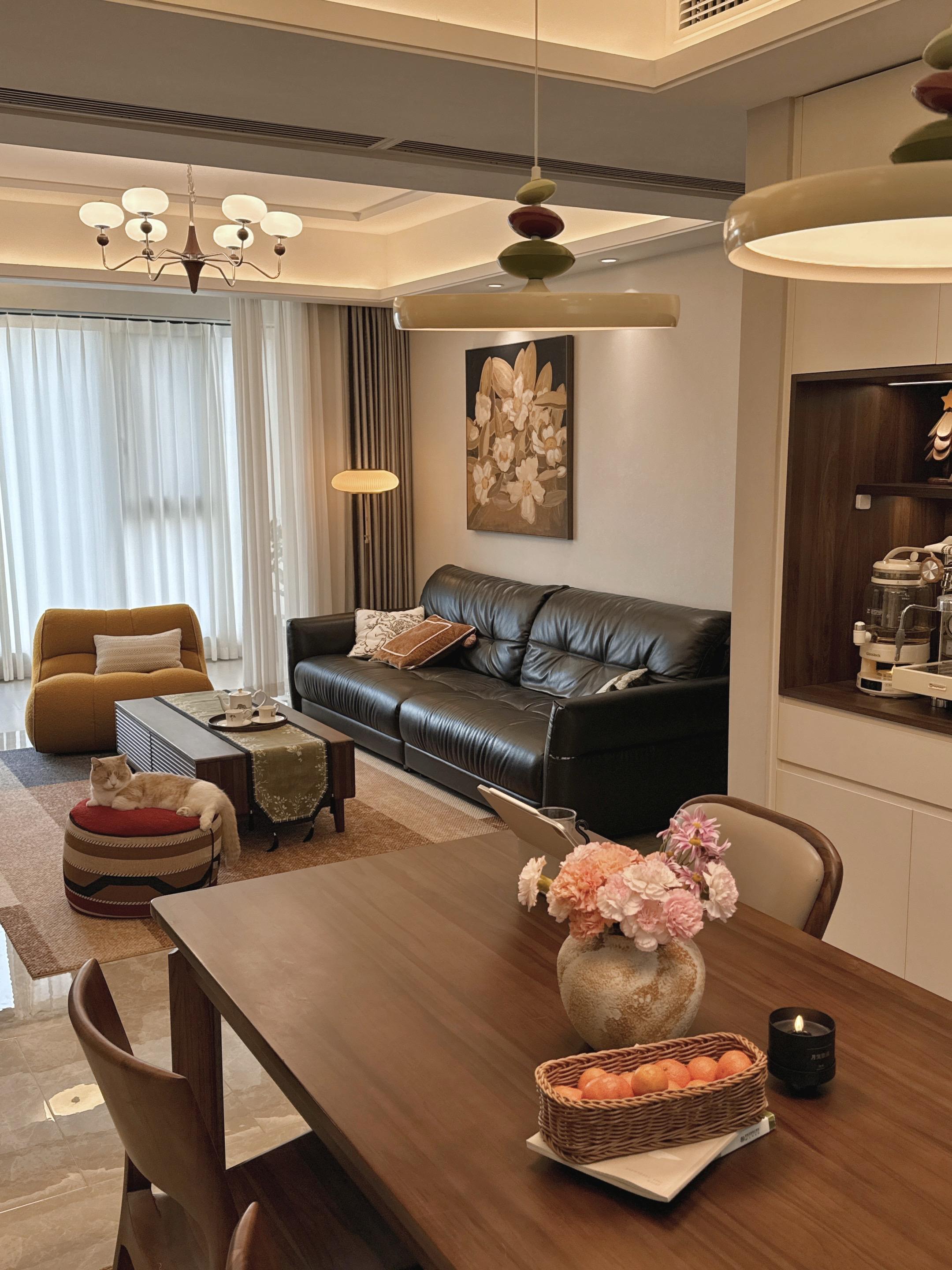 舒适,好看,有归属感,才是家的意义。寒潮一来就彻底赖在家里不想动! 暖黄灯光漫过黑色沙发, 羊毛地毯裹着脚丫子, 连猫咪都蜷成毛茸茸的暖团子~ 切上水果,点上香氛蜡烛, 无论是办公,追剧还是发呆, 都多了一丝居家仪式感,幸福满足上了 中古风精装房改造软装搭配宅家装修