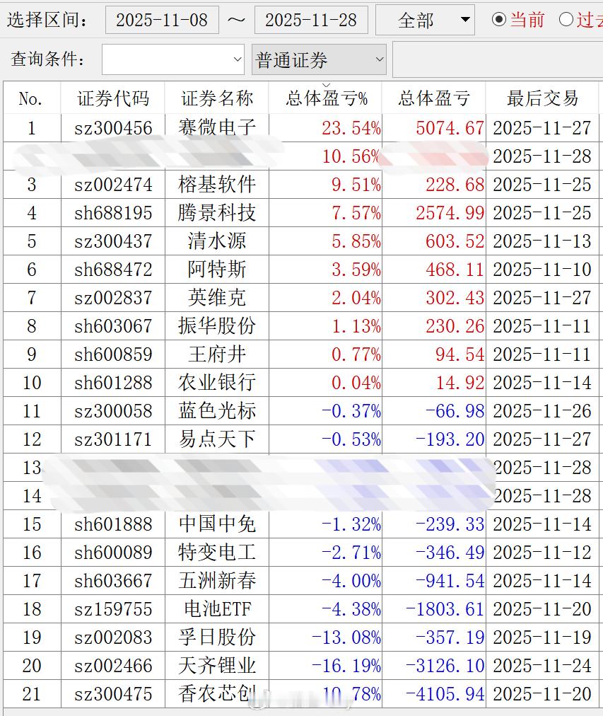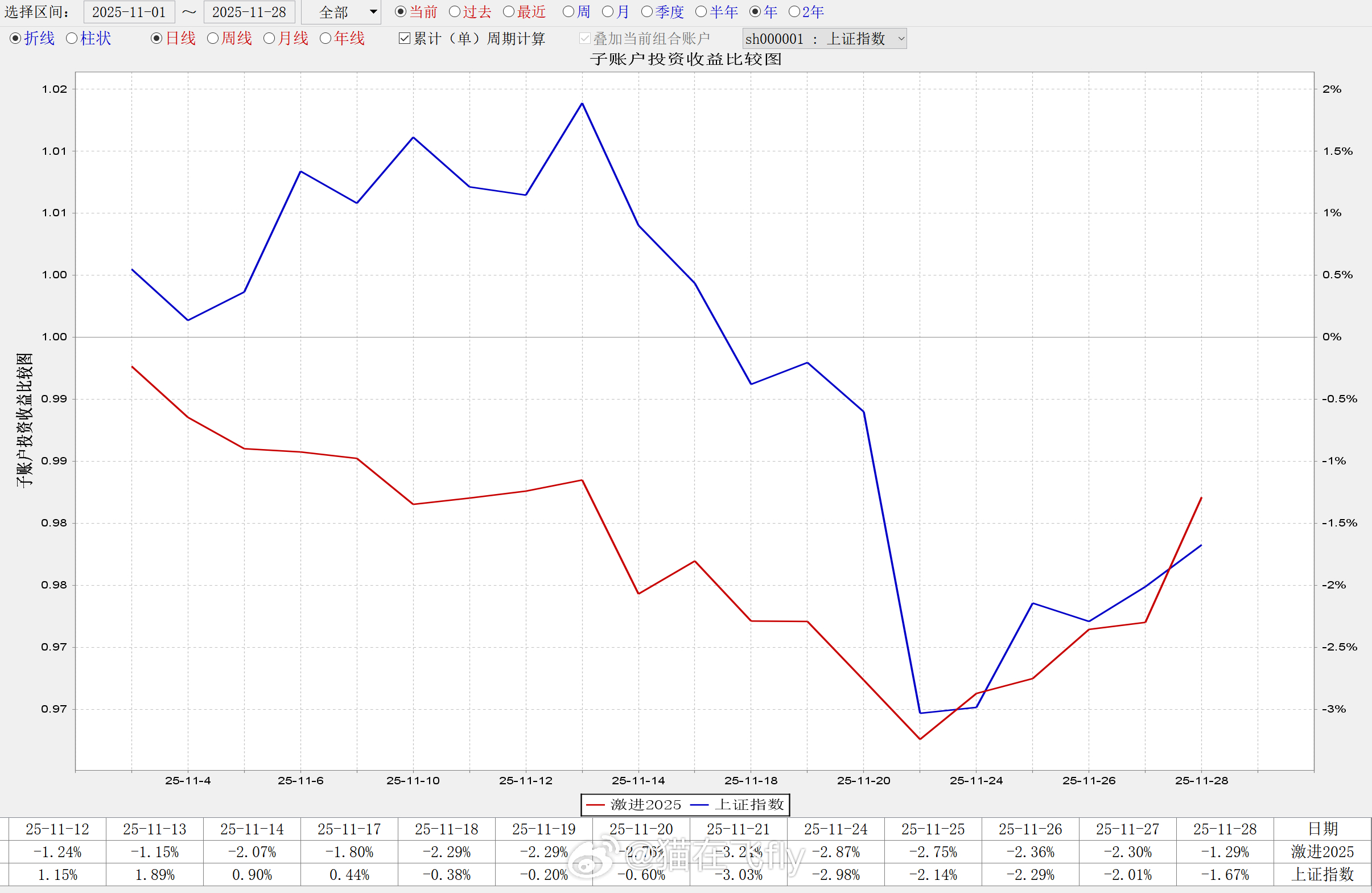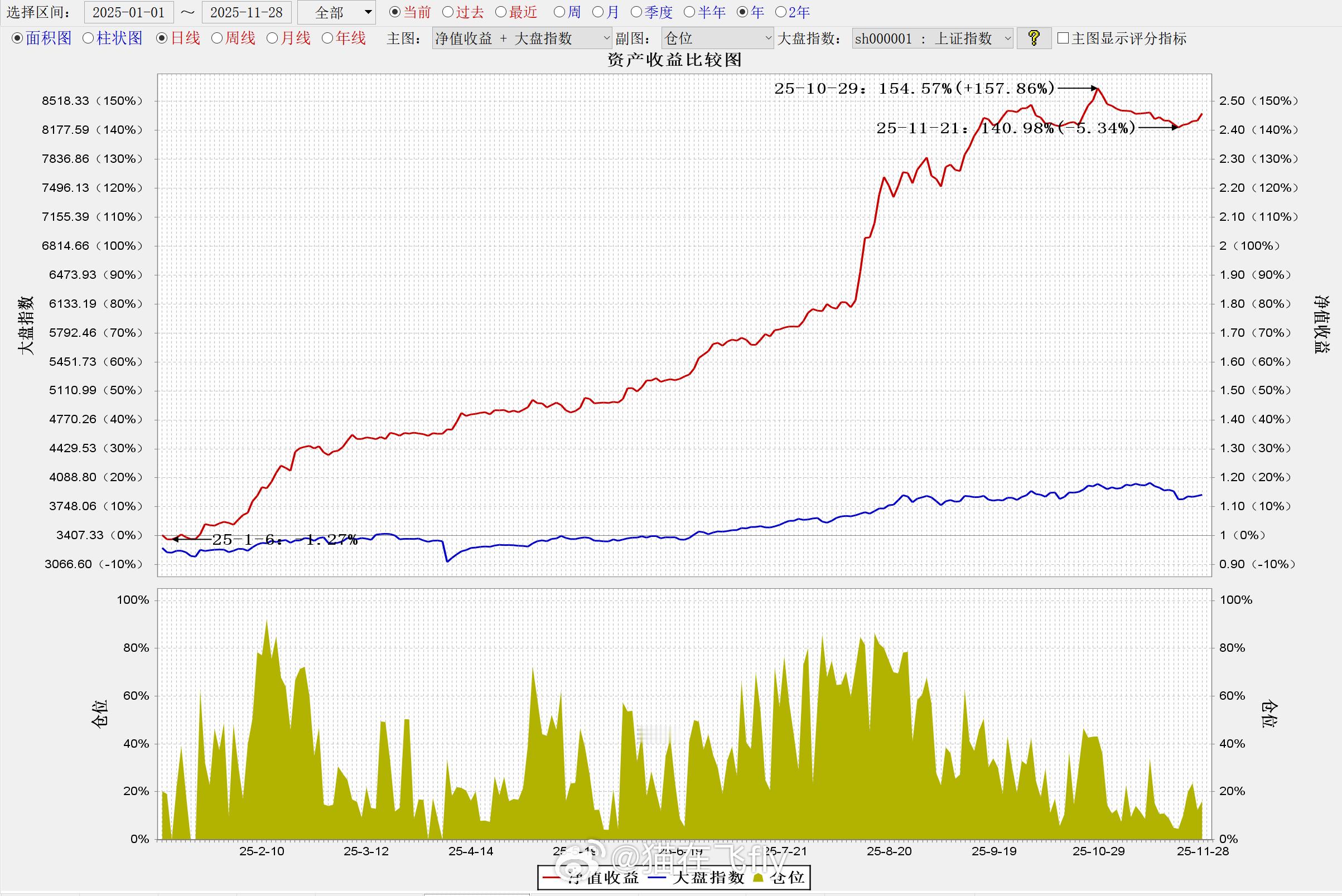 【V+模拟教学持仓25年11月总结】25年11月最后收官:-1.29%这是25年第一个月度亏损,其实是蛮可惜的。 咋说呢,人都会为自己犯的错付出代价,我自己频繁操作的代价就是:信心的短暂丧失。我觉得不需要解释什么,也许下次,自己能更坚决,更坚定一些,就说这么多吧。 图1是全年分月收益图。 图2、3是11月净值走势。 图4是截至11月末的25年全年走势,目前收益145.85%-------------这个模拟账户是20w起步,8月25日,10月21日分别转出5w,共转出10w相当于现在的本金是10w目前账户情况见图5,11月全部的模拟操作见图6(铁粉群的同学可以一一对照学习节奏)------------嗯,这个是模拟账户,用来教学的,做个记录