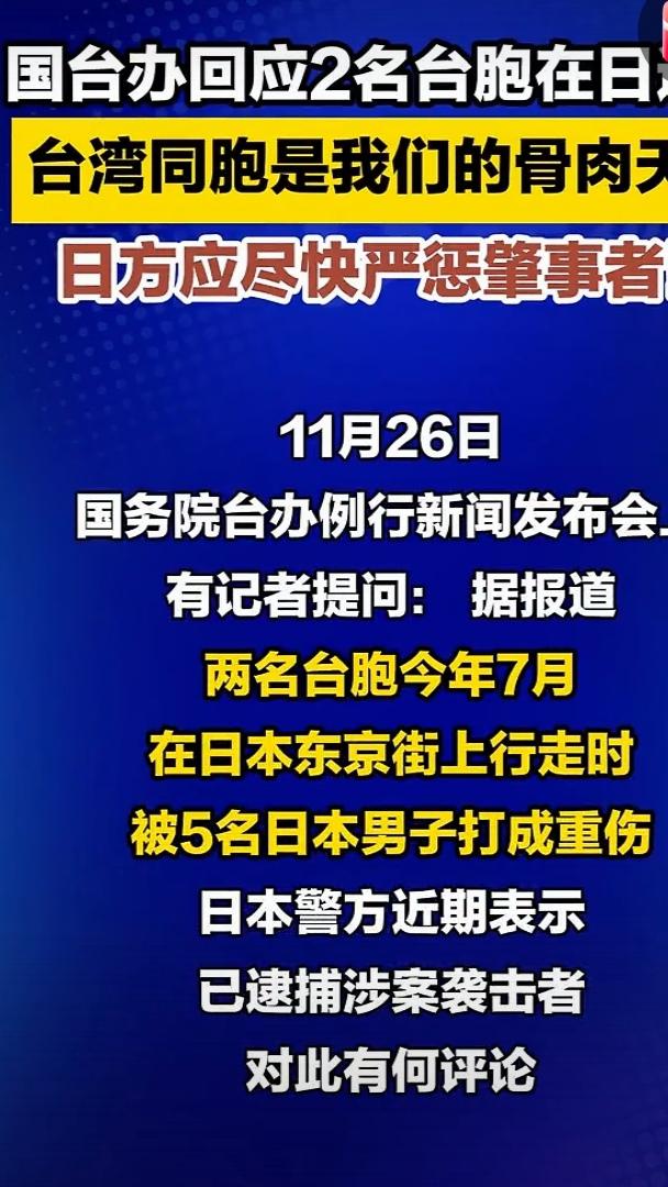 震惊!2名台胞日本街头遭铁管围殴至重伤 5名暴徒跨区作案终落网 东京街头突发恶性暴力事件 两名中国台湾同胞光天化日下被打得头破血流 今年7月31日上午9点刚过 东京千代田区神田须田町的街头 5名日本年轻男子像疯狗一样扑向两名台胞 先掏出催泪喷雾对着两人猛喷 呛得他们睁不开眼失去反抗力 接着抡起铁管朝着面部疯狂猛击 下手又狠又毒 还试图抢走两人的行李箱 见没能得手 这伙人迅速跳上提前租好的车溜之大吉 更让人愤怒的是 他们作案前早就踩好点 故意破坏了周边的监控设备 摆明了是有预谋的犯罪 直到11月21日 日本警方才将这5名暴徒抓获 年龄都在18到23岁之间 都是通过网络搭伙的跨区作案团伙 分工明确得很 4人负责现场施暴 1人专门跑腿租车 目前案件还在进一步调查 不过警方没说这些人到底认不认罪 11月26日国台办例行发布会 发言人彭庆恩直接硬刚 台湾同胞是咱们的骨肉天亲 这种泯灭人性的暴力行为必须强烈谴责 还点出关键 今年日本已经发生多起游客遇袭事件 加上近期日方涉台挑衅言论 右翼反华仇华的极端行为越来越多 就像潜藏的暗雷 给同胞出行安全埋了大隐患 要求日方赶紧严惩这些肇事者 外交部早就严正交涉 驻日大使馆连发安全提醒 文旅部也让在日游客绷紧安全弦 海外出行本是图个开心 却遭遇这种无妄之灾 实在让人心疼又气愤 你觉得日本治安是不是越来越差 海外同胞该怎么保护好自己 来评论区聊聊