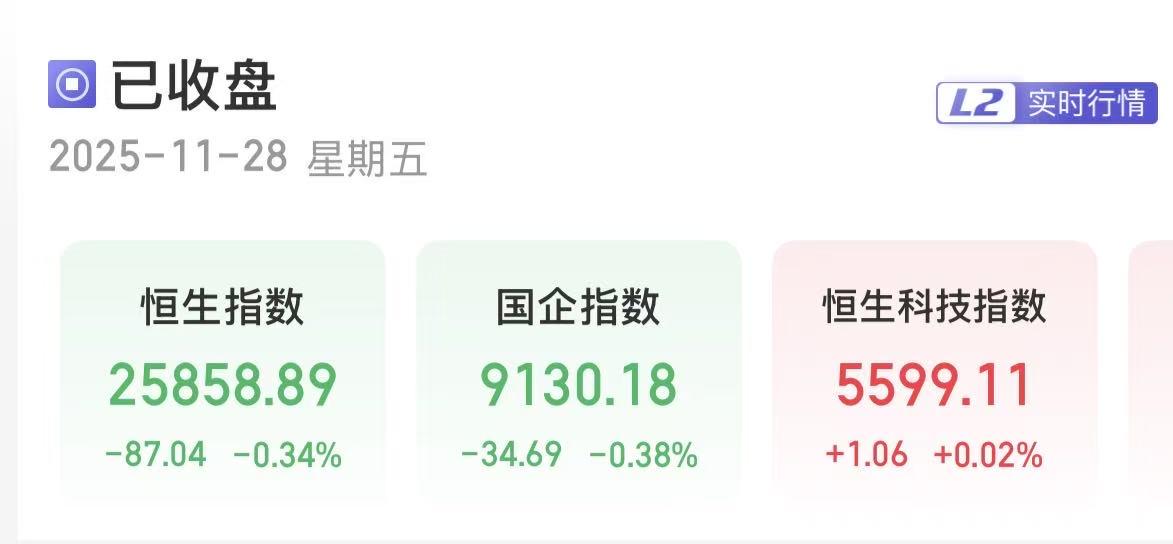 上证报中国证券网讯(刘禹希记者严晓菲)11月28日,港股三大指数涨跌不一,恒生科技指数收涨。截至收盘,恒生指数跌0.34%,报25858.89点;恒生国企指数跌0.38%,报9130.18点;恒生科技指数涨0.02%,报5599.11点。