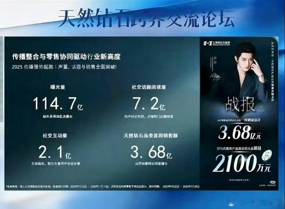 邓为 代言天然钻石获114.7亿曝光量 !社交话题阅读量7.2亿,社交互动量2.1亿!天然钻石品类首周销售额3.68亿!好牛啊!