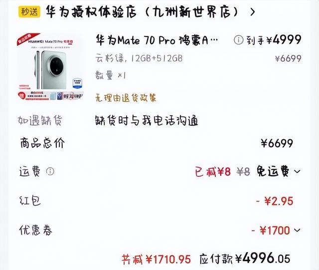 就拿华为Mate70Pro512GB来说,原价6699元,领[国补降价330]补贴1000元,再加上店铺直降710元,到手只要4996元。而且还支持24期免息,算下来每月仅需258元,轻松无压力拿下高端旗舰机,畅享华为超强影像、流畅性能。