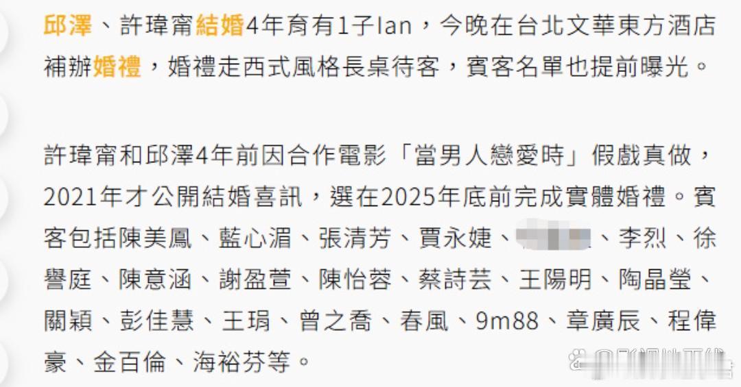 据台媒,许玮甯邱泽今晚将在台北文华东方酒店补办婚礼,婚礼走西式风格长桌待客。两人4年前因合作电影《当男人恋爱时》走到一起,