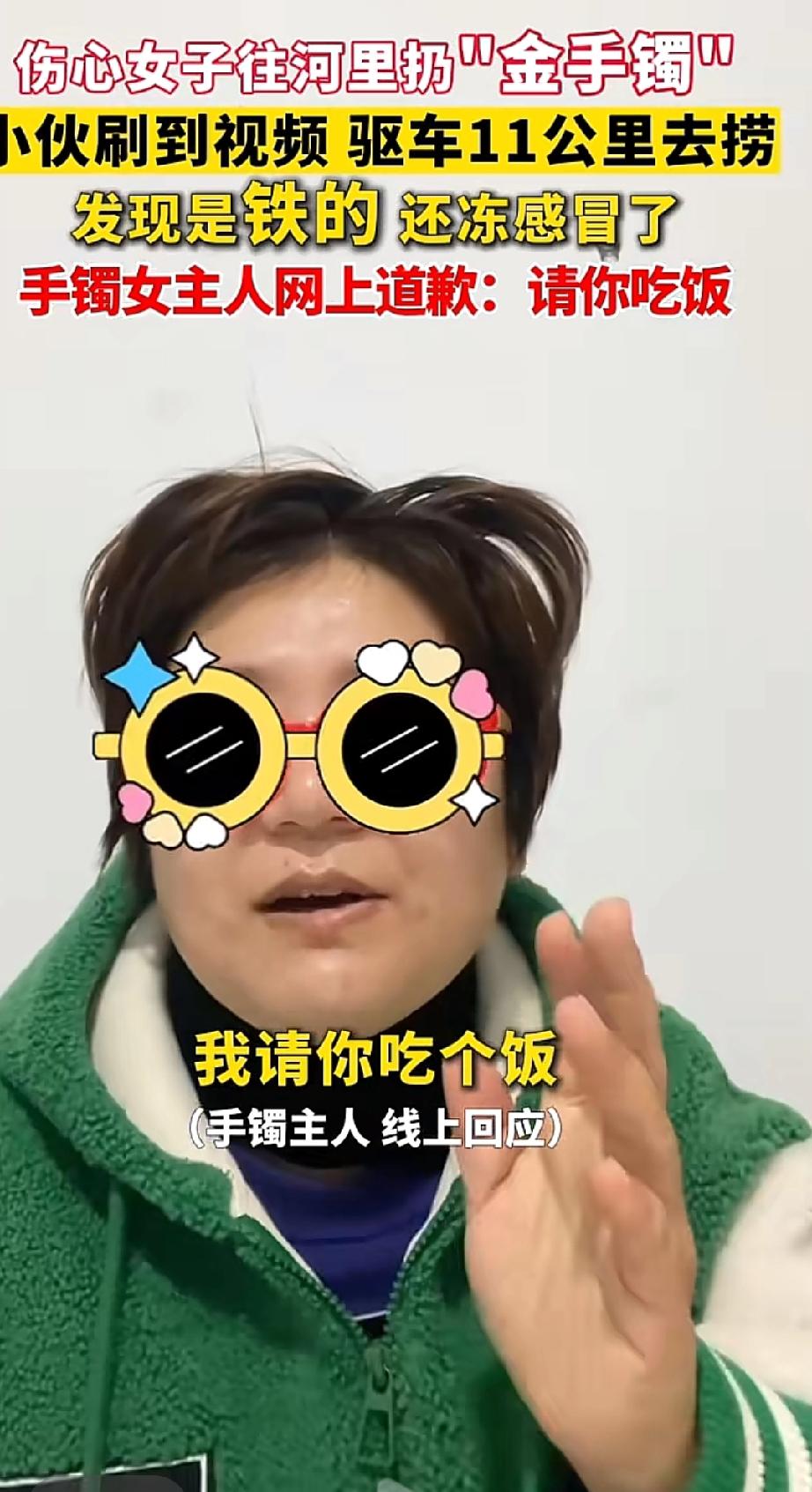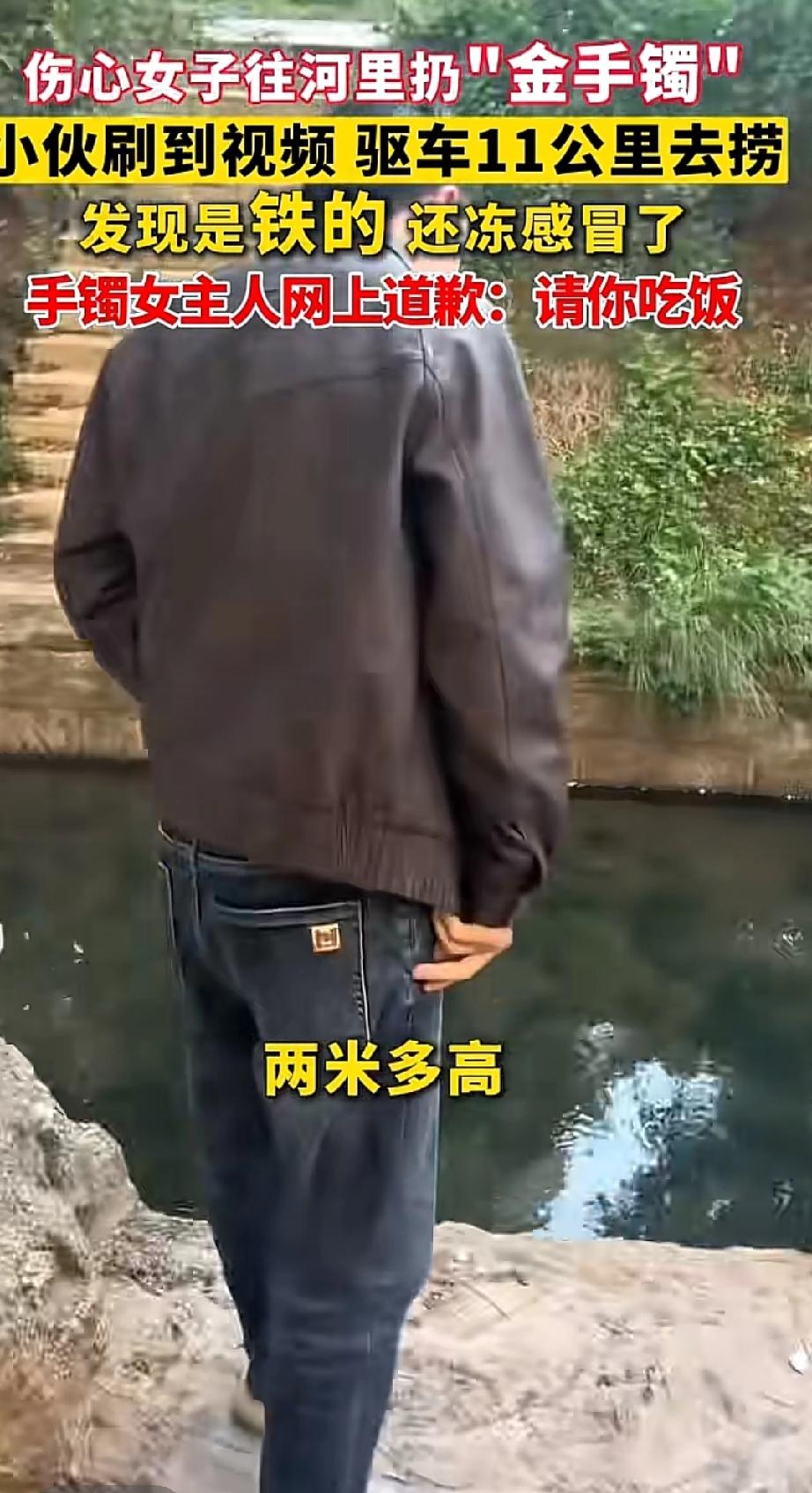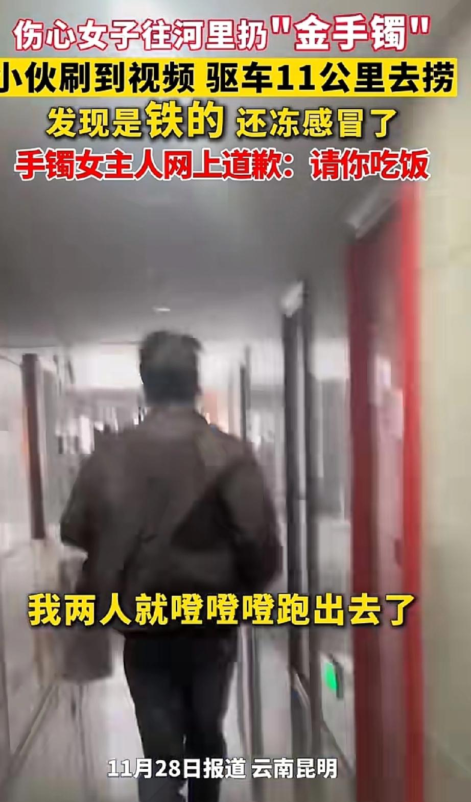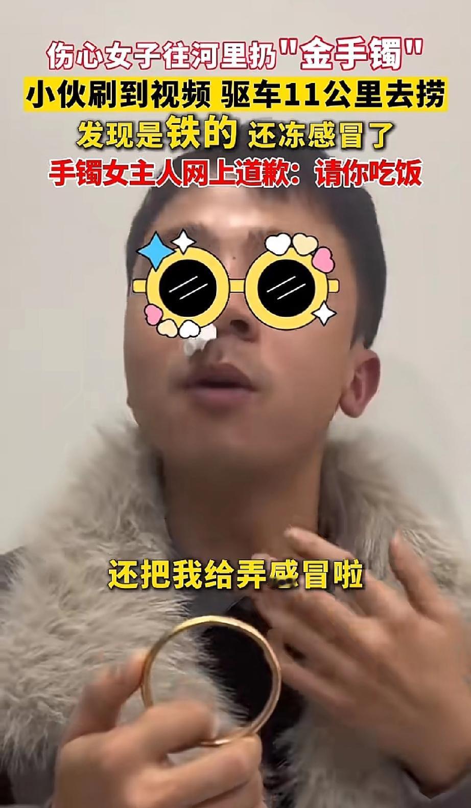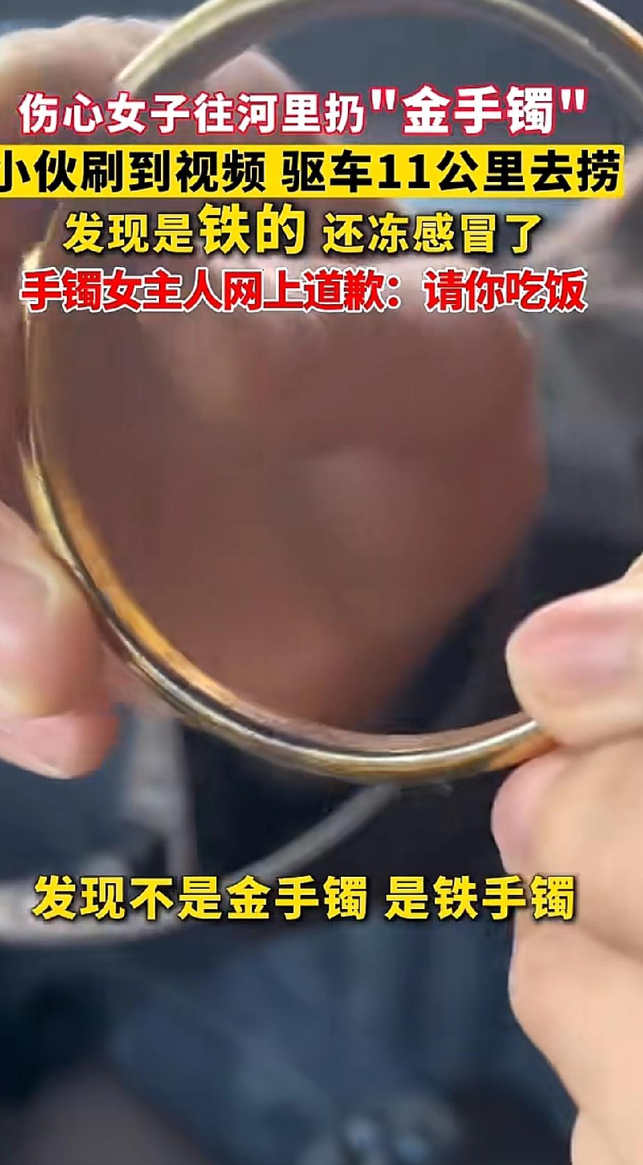 云南昆明,一位中年大姐伤心地将“金手镯”丢进水里,还拍下当时的画面,配上忧伤的音乐发布到网上。 有个小伙和朋友刷到视频后,根据大姐视频定位和周围环境,推断出大姐扔“金手镯”的具体地点,接着驱车11公里赶到河边。岸边到水面大概两米,河水一米多深,清澈见底,男子一眼就瞧见了河底的“金手镯”。 男子顿时两眼放光、心花怒放,毫不犹豫地“咔嚓”一声跳进水里,捞起了“金手镯”。 回到家,男子摩擦了一下手镯,上面的金粉掉落,露出黑乎乎的底色,哪是什么“金手镯”,分明是涂了金粉的铁手镯。 男子一侧鼻子塞着纸巾,在网上吐槽道:“哪能这么忽悠人啊,把我都弄感冒了。” 小伙把自己捞手镯的过程发到网上,大姐也刷到了他的视频,大气的回应小伙:“这手镯的来历我就不说了。我这人爱交朋友,小伙来,我请你吃顿饭,就当给你赔个不是。” 这手镯可能是大姐情感受伤,又发现男友送的是假金手镯,才去扔掉的吗?也可能是别人借钱的抵押物,最后发现是假的,更有可能大姐是为拍视频编的情感剧本。 小伙也许是想淘金,占便宜,真以为能捡到金手镯,最后惹的感冒的下场。 或许大姐和小伙合着演了一出戏? 两人都操着北方口音,生活在昆明。 或许北方人都很实诚,这只是一个美丽的误会。 不过昆明现在的天气4-13℃,水里里凉飕飕,冷冰冰的,大概零度左右,跳入水里真的会冻感冒。 不管怎样,人不能有占小便宜的之心,也不能为了流量网上编剧本骗人,最后都会自食恶果,还是端端正正的做个人最好。 来源:阜阳公众网