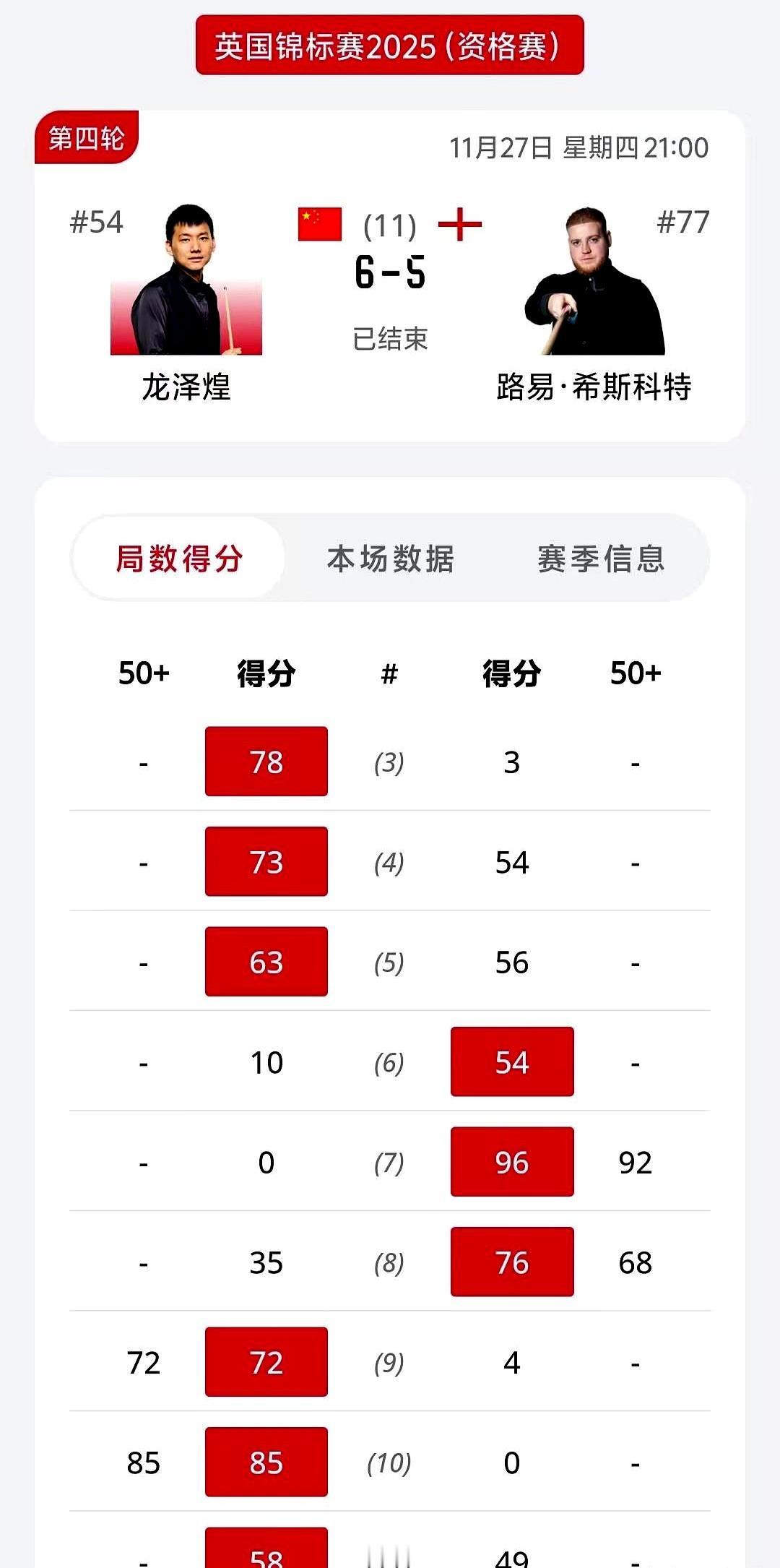 斯诺克英锦赛资格赛最近有结果了,排名54的龙泽煌真够劲——6比5绝杀77位的希斯科特,直接进正赛。这小子排名不算顶尖,但关键时刻敢拼啊,就像平时跟朋友打球,你段位比人高,可人家最后几局豁出去了,说不定就反超。 庞俊旭也稳,6比2赢了泰国的桑坎姆,同样晋级正赛。周跃龙凌晨打克拉克更干脆,6比2拿下,直接进32强。 国内这几位选手这次表现挺提气,尤其是龙泽煌那绝杀,看着就过瘾。斯诺克这东西,排名是参考,但真打起来,拼劲和状态才是硬通货,谁都别想轻易拿捏谁。