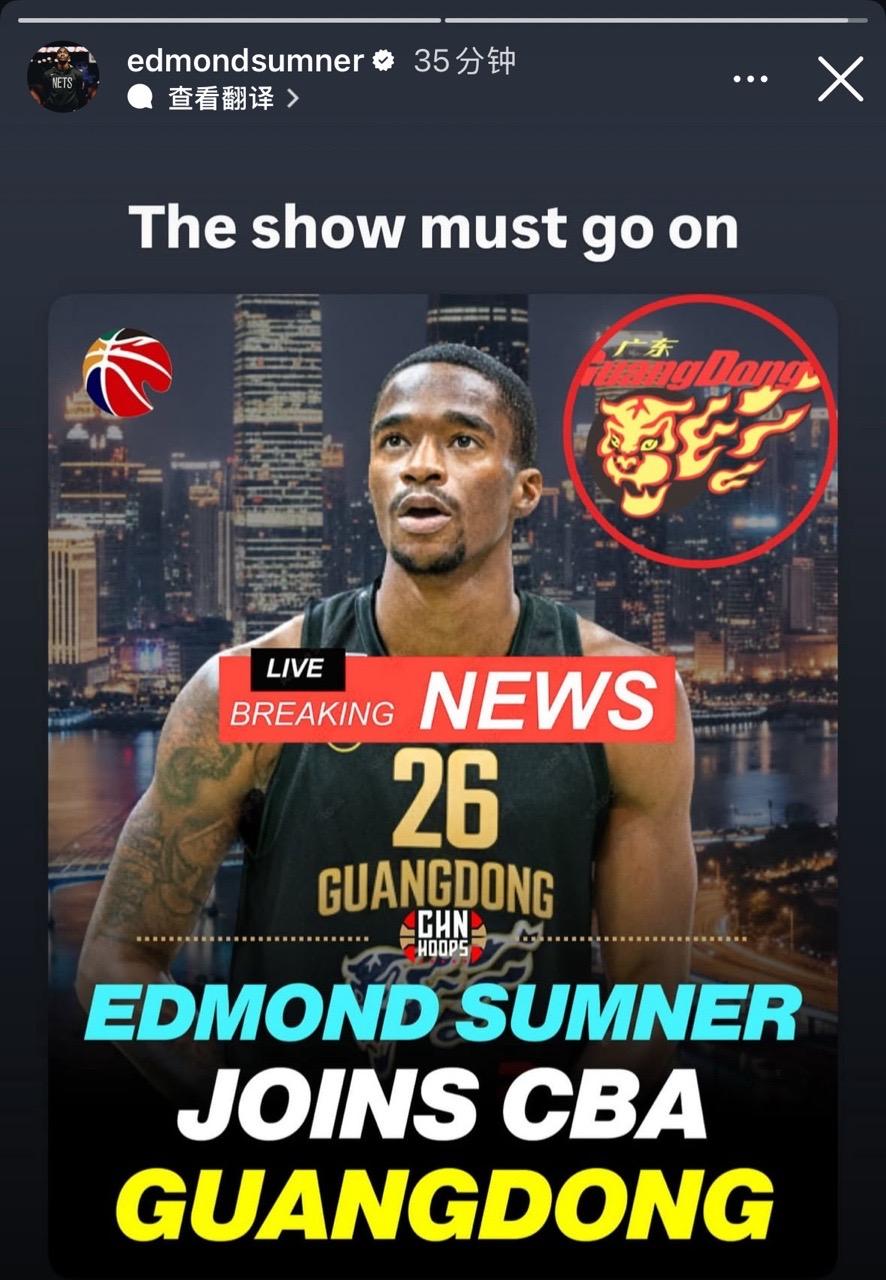 虎扑11月28日讯今日,广东男篮正式官宣,外援艾德蒙-萨姆纳正式加盟球队。