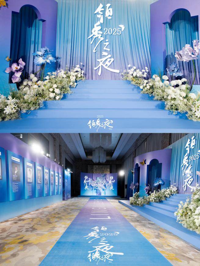 本次“领秀”舞台的设计,源自发起人汪立群的初心。整体造型如蝴蝶幻化成的双臂,张开怀抱,寓意包容共济。舞台以蝶翼,融合西湖、钱塘江等杭州城市元素,展现江南韵味与现代风尚。主背景以天青色、凝夜紫渐变铺开,圆桌点缀月白色满天星,氛围温馨。