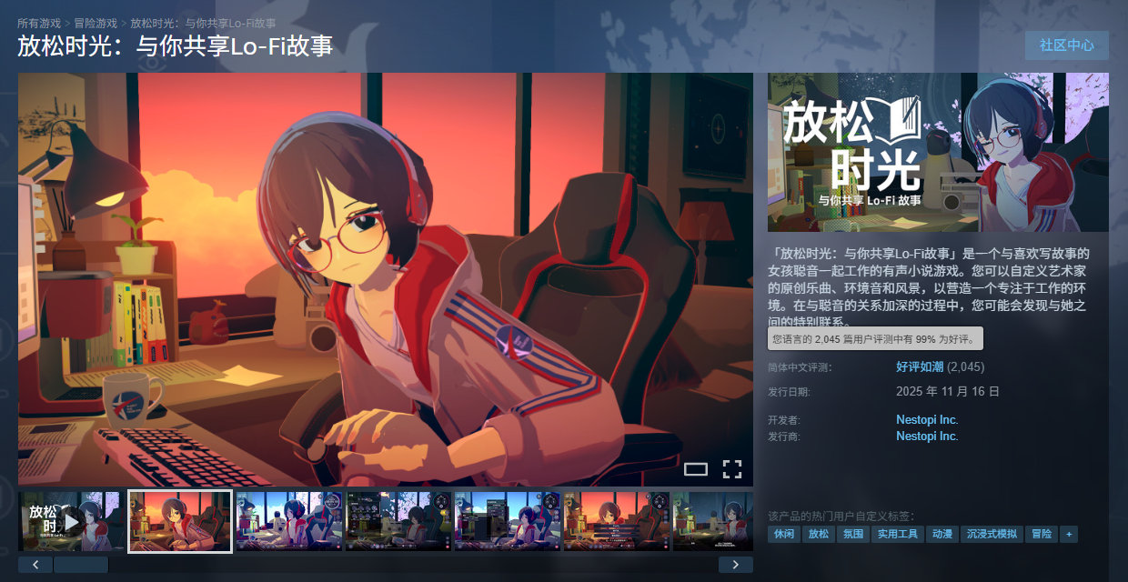工作陪伴有声小说游戏《Chill with You : Lo-Fi Story》官方公开的销量贺图合集,本作销量已突破9万份,目前在Steam上的国区好评率为99%,收录超2000篇玩家评测。