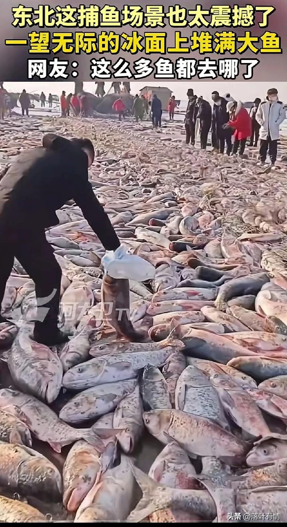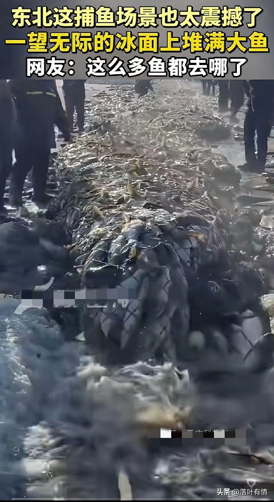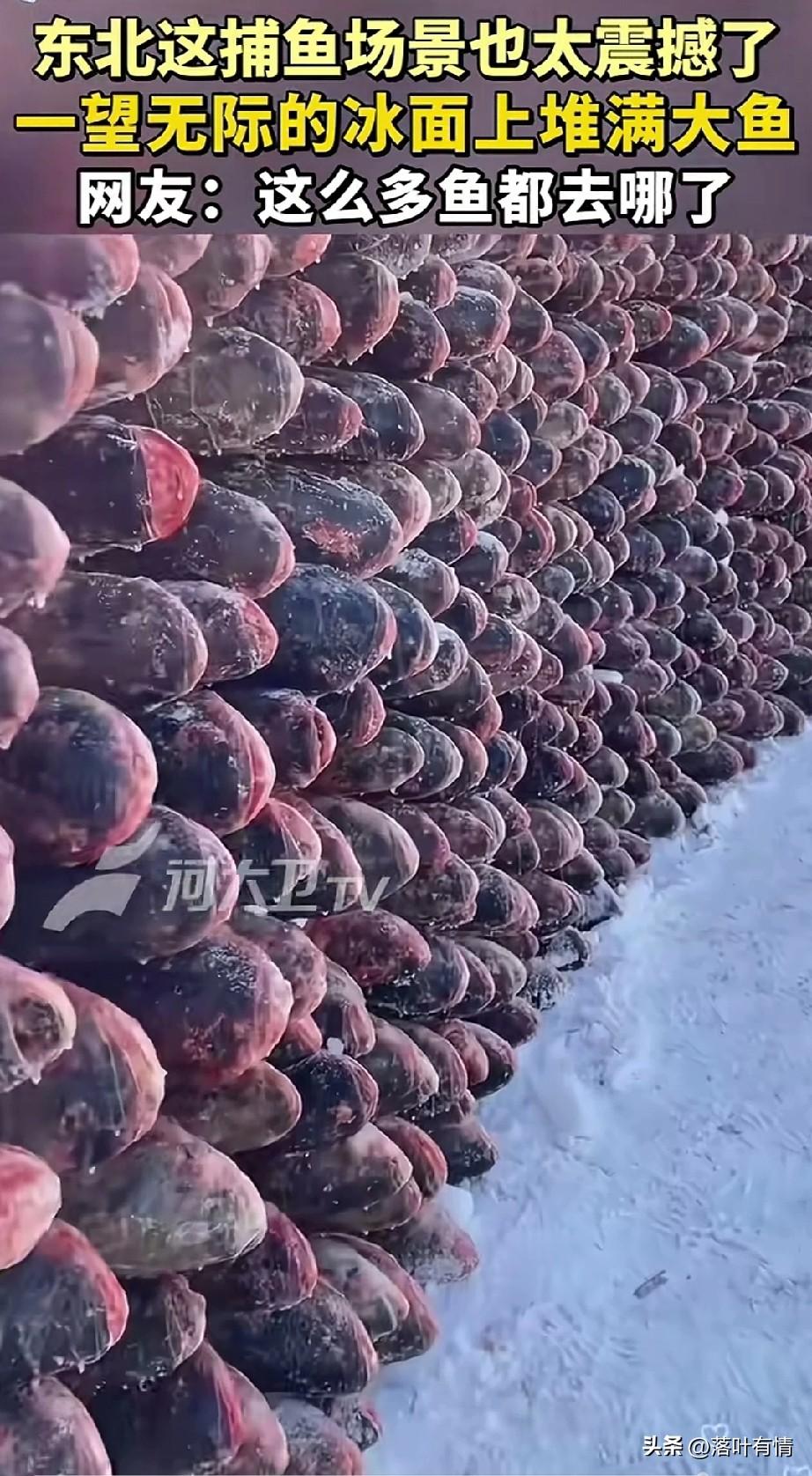 东北这捕鱼场面太震撼, 你直接拿着管管, 在冰面上打一个洞, 然后拿着长长的地笼, 往冰底下一塞, 随后就等着想要呼吸空气的鱼儿进入地笼就可以了, 由于鱼太多了, 只能叫来了一辆农用车, 拖着长长的地笼, 里面充满了胖胖的鱼, 后边冰面上全部都是鱼, 由于天气非常寒冷, 脱离水的鱼很快就死了, 鱼死后就被冻起来了, 放在露天都不会坏, 露天就是是天然的大冰箱, 冻好的鱼被摞了起来, 形成了一道壮观的鱼墙! 大家对于东北的捕鱼场面怎么看? 捕鱼 湖面捕鱼 捕鱼方式 冰捕鱼 东北捕鱼 东北冬天捕鱼 冰雪捕鱼
