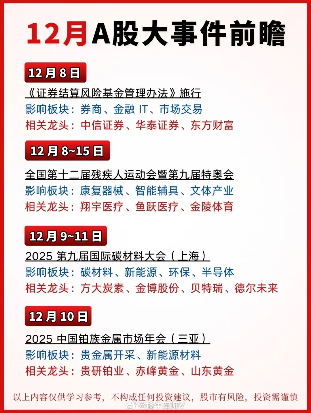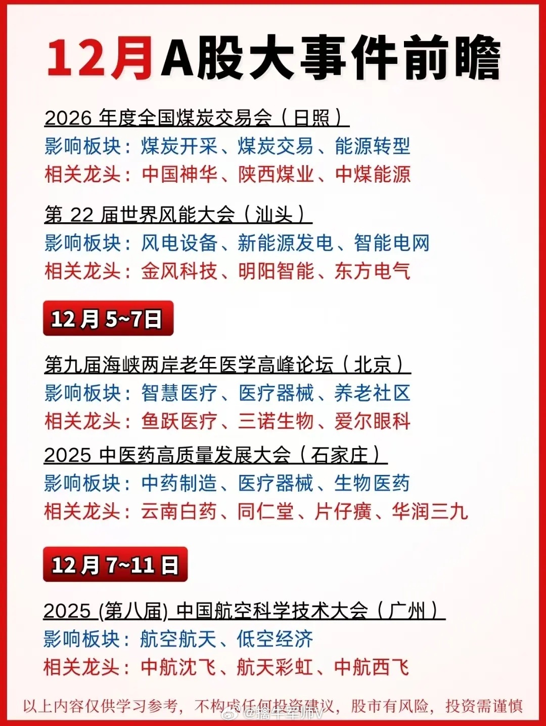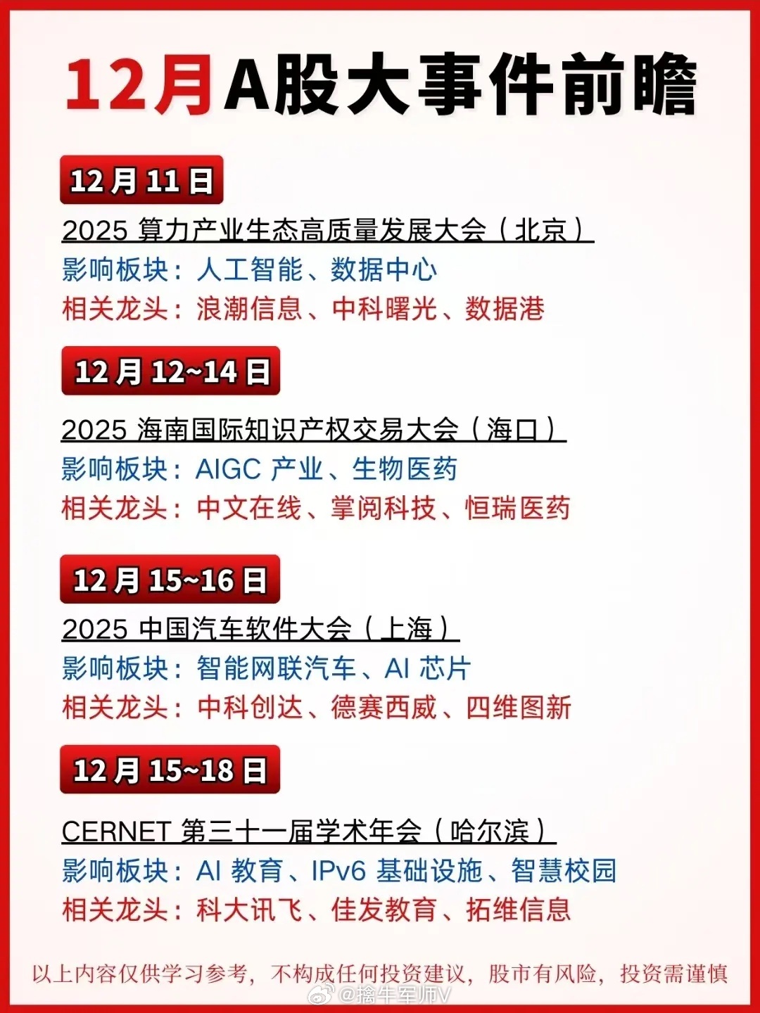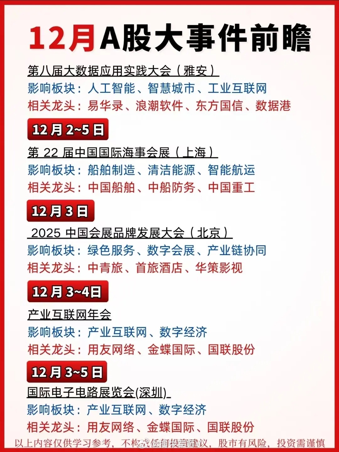 十二月重大财经事件提前看!根据公开资料显示,十二月份值得关注的财经事件有人工智能产业生态大会、大数据应用大会、产业互联网年会、算力产业大会、通信技术年会、世界风能大会、海南自贸港封关等等,相关事件题材概念龙头代表有哪些?(1)2025“人工智能+”产业生态大会由中国互联网协会主办,将于12月1日 - 3日在北京中关村举办,人工智能龙头代表有科大讯飞、浪潮软件等等。(2)2025算力产业生态高质量发展大会定于12月11日在北京举办,大会主题为“协同·跃升·赋能”。算力概念龙头代表有数据港、中科曙光等等。(3)2026年度全国煤炭交易会将于2025年12月3日 - 5日在山东日照召开,主题是保障煤炭安全稳定供应。相关概念龙头代表有陕西煤业、中国神华……理财有风险入市需谨慎!資料全网公开透明,仅供参考不能作为投资依据。财经大事件速报