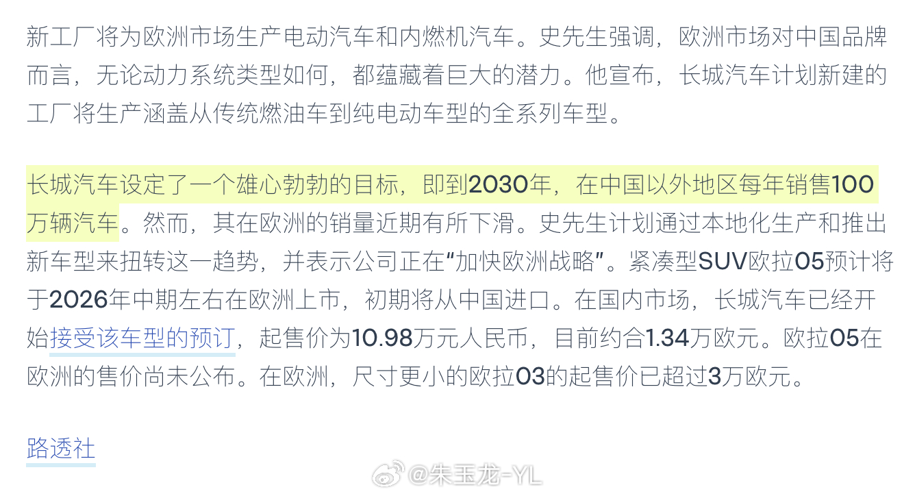 长城准备在欧洲建设第一座全资工厂,目标是2029年就要投产,年产30万辆!现在就剩最后两选一:西班牙 VS 匈牙利!劳动力、物流、关税、政治环境,都要考虑,而且纯电、混动、燃油车全都要造!从战略来看,长城现在设置的目标是2030年海外年销100万辆,欧洲需要承担销量的计划,欧拉05 2026年登陆欧洲!新能源汽车大V聊车长城汽车