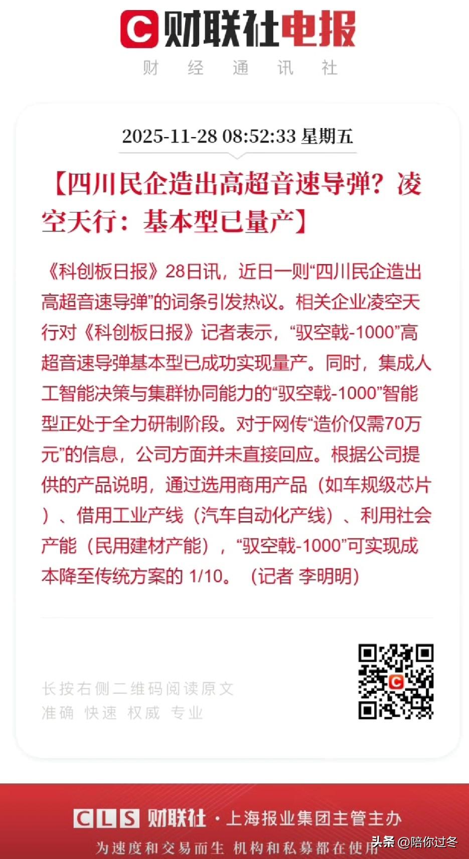 四川民企“手搓”高超音速导弹!已量产![赞] 恭喜四川这次上大分了,欧美日韩都还没有造出来的高超音速,居然被四川民营企业给造出来啦![赞]而且已经量产了“管够、管饱”成本更是低的离谱,就问服不服吧![捂脸] 11月28日,据媒体报道,四川凌空天行公司公开表示“驭空戟﹣1000”高超音速导弹基本型已成功量产。 射程500-1300公里可全面覆盖日本全境及第一岛链,速度5-7马赫,具备末端机动变轨和智能识别目标能力,可精准打击海上移动目标,比如航母和战舰等,可谓是全能型“杀手”。[鼓掌] 除此之外“驭空戟﹣1000”性价比非常高,共体现在2个方面,第一个就是造价非常低仅要70万美元,相比与美国的非高超“暗鹰”也要4000万美元,这差距不是一般的大。 第二个就是隐蔽性极强、机动性强,据了解“驭空戟﹣1000”是车载集装箱式发射,可以全国到处流动,放在集装箱里不容易被发现。 中国高超音速导弹本来就是全球顶尖,感觉现在又上了个台阶了,目前在民企中只是开始,相信不断升级后性能会更加完善!不知道日本看到这个新闻会有什么感想[捂脸] 超音速导弹 超音速变轨导弹 中国超音速飞机 马赫超音速导弹 超导弹飞机