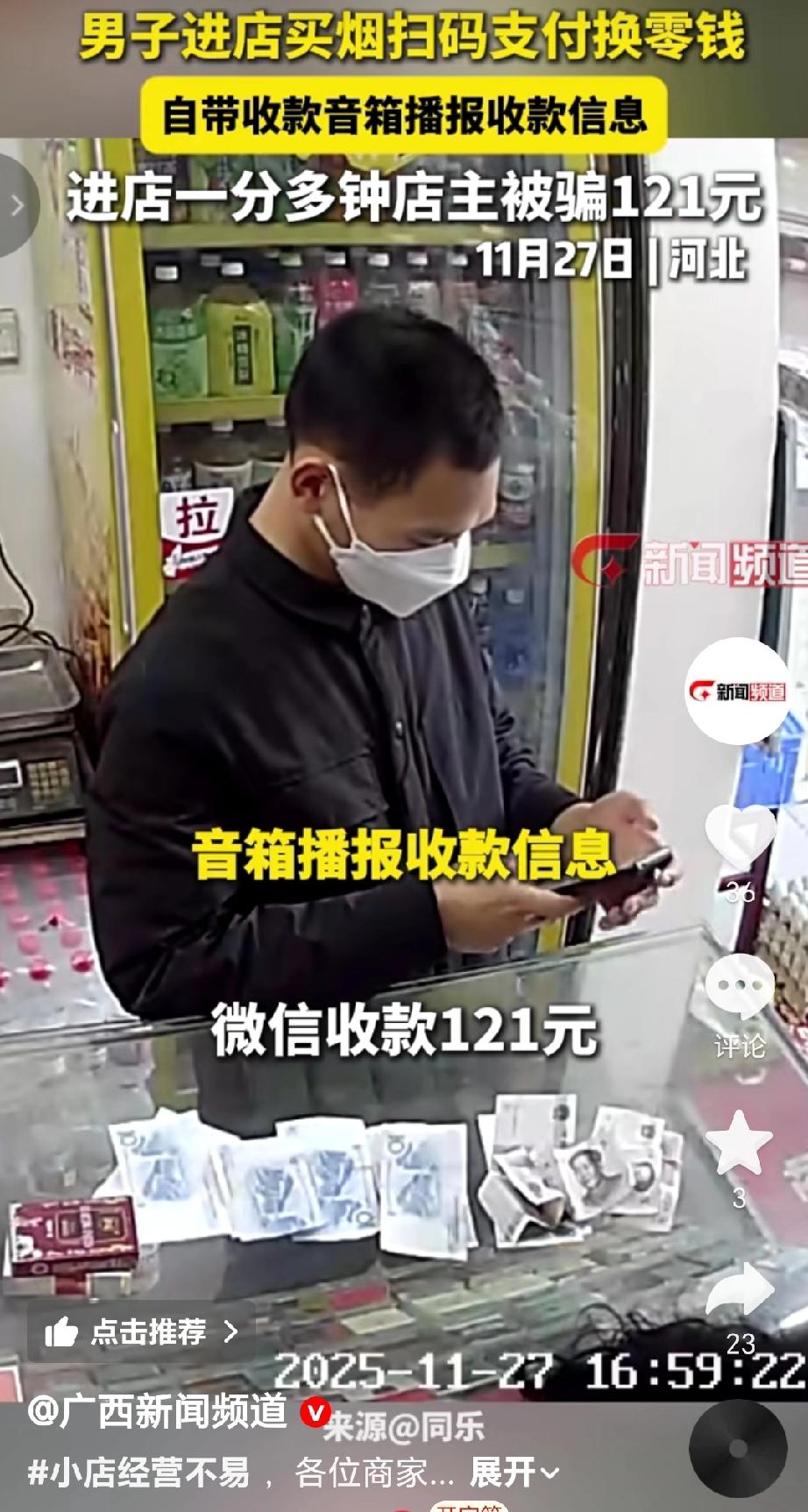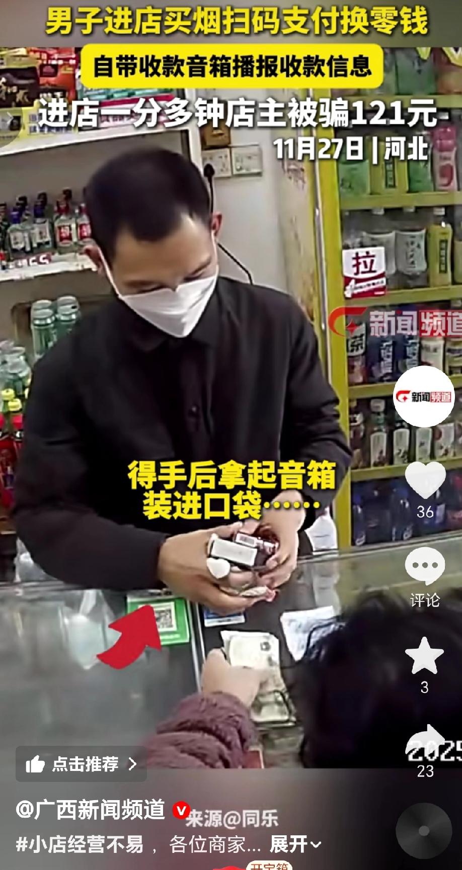 2025年11月27日河北,一男子到小店买烟并换零钱,他自带用手套包好的收款音箱。在扫码支付时,男子当着店主的面扫码,输入了换零钱和香烟的钱(共121元),并将自带的音箱放在柜台上。随后他切换手机屏幕,其自带的音箱播报“微信收款121元”,店主误以为是自己的收款音箱播报,男子借此骗走121元,得手后他拿起音箱装进口袋离开。大家还是得警惕一下。