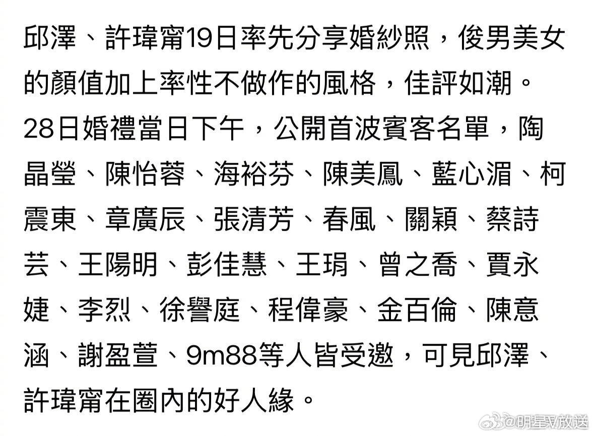 邱泽许玮甯婚礼嘉宾名单 28 日晚,邱泽与许玮甯的婚宴在台北文华东方酒店举行,首波宾客名单于当日下午公开,陶晶莹、陈怡蓉、海裕芬、陈美凤、蓝心湄、柯震东、章广辰、张清芳、春风、关颖、蔡诗芸、王阳明、彭佳慧、王琄、曾之乔、贾永婕、李烈、徐誉庭、程伟豪、金百伦、陈意涵、谢盈萱、9m88 等演艺圈大咖均受邀出席,涵盖影视歌三栖艺人,尽显两人圈内好人缘。此前 11 月 19 日,邱泽与许玮甯已发布率性不做作的婚纱照,收获大量好评;婚礼当天则以 “亲友祝福” 为主轴,低调却不失质感的安排,让这场演艺圈盛事既温馨又充满星光。