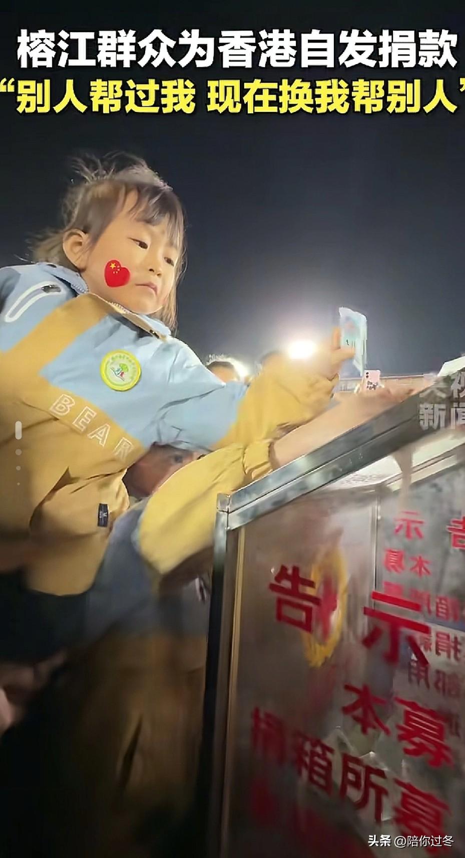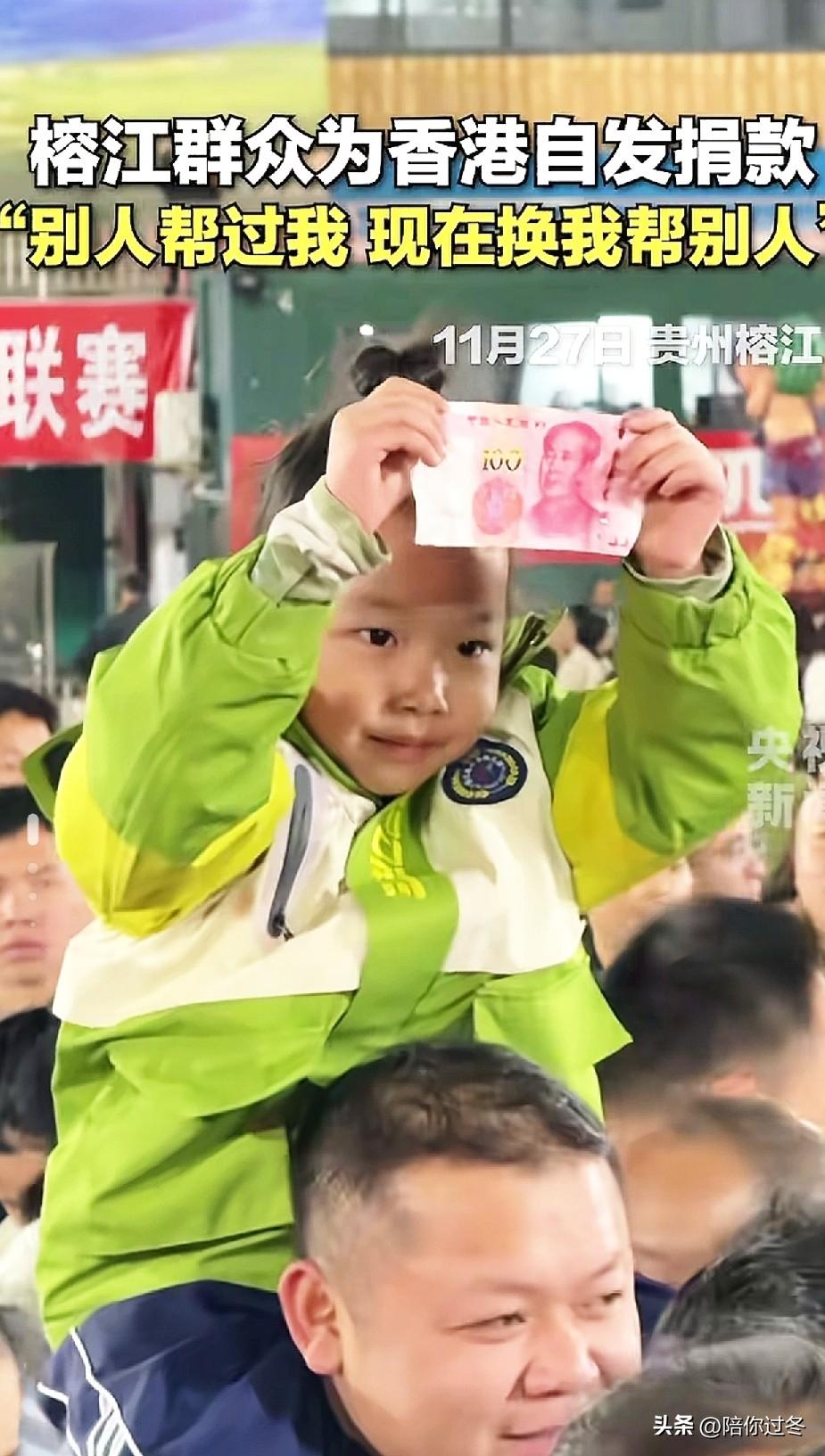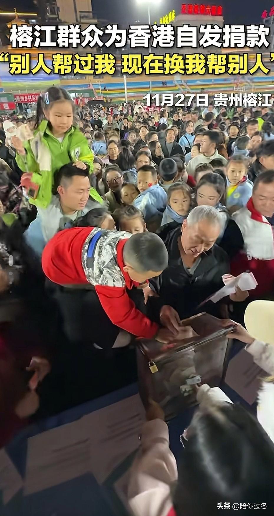 榕江群众自发为香港捐款![赞] 让人泪目,烈火无情,人间有爱,上到95岁老奶奶,下到5岁小朋友,从5元到100元不等,中国人就是这样我们素不相识,却又心连着心![祈祷] 11月27日晚,榕江县红十字会响应香港大埔火灾,在标志性“村超”球场设立捐赠点。 数千名群众连夜聚集,有的还特地从外地赶来,现场被围的水泄不通,最引人注目的莫过于这位95岁高龄的侗族奶奶杨留香了,她喊到:“加油香港”让人泪目,并捐出50元积蓄。[流泪] 还有许多小朋友抱着存钱罐在家长的带领下投入零花钱,从10元至百元不等,大家的爱心已汇成星河,照亮远方。 我想说的是香港的家人们不要怕,你们不是一个人作战,你们身后有14亿同胞,56个民族,我们永远都是一家人。 人间有爱,大爱无疆,为淳朴的榕江点赞,为全国所有默默奉献的人点赞![赞]榕江捐款 榕江捐赠 榕江为香港捐款