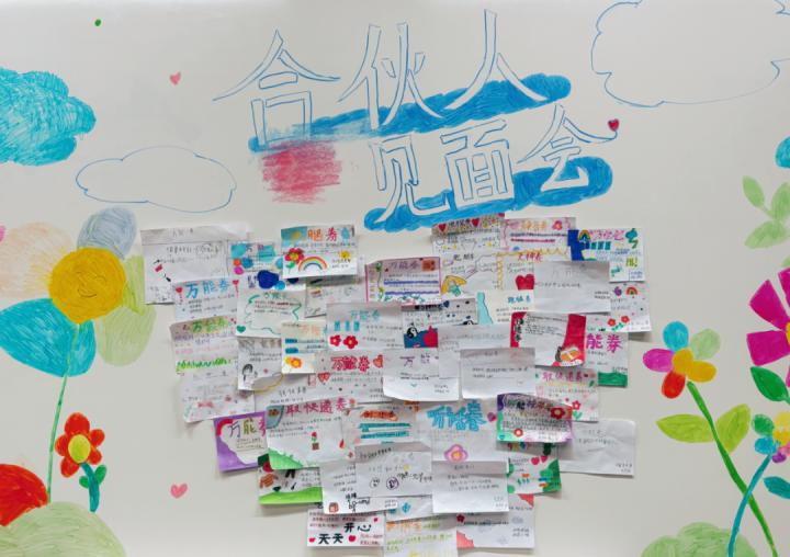 申花小学沈波老师昨晚在朋友圈分享了许多家长会的班级布置照片。其中一个班级孩子们精心制作了手绘万能卡,贴在墙上让爸爸妈妈自取。