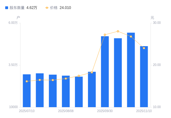 近一年(2024年12月31日至2025年11月10日),初灵信息A股股东户数从3.12万户,增加至4.62万户,增幅48.24%,区间股价上涨63.44%。