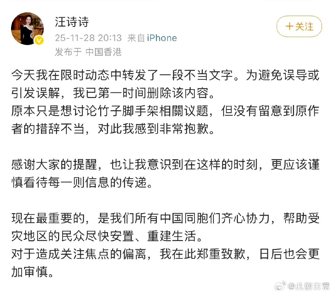 最近甄子丹妻子汪诗诗,因为转发香港火灾事情摊上事了! 11月28日,汪诗诗在Ins限时动态转发文字,称香港火灾蔓延主因是“承包商使用来自中国的不符合标准的易燃网和泡沫密封剂”,还强调“竹子并非高度易燃”。 此时官方调查尚未有定论,且科普博主已证实,作为香港非遗建材的竹子燃烧仅需7-8秒,与塑料围网共同构成火灾风险。 所以单说到是“承包商使用来自中国的不符合标准的易燃网和泡沫密封剂”,这个言论就让人接受不了。 事后汪诗诗迅速删除该动态,并于当日20:13在微博发布中文道歉声明,解释初衷是讨论“竹子脚手架环保议题”,因未留意原作者措辞不当引发误解,同时呼吁同胞齐心协力救灾。 但网友发现,这份道歉仅同步微博,未在Ins发布。 对此网友直言“你和甄子丹都是中国人,怎能如此措辞”;加之甄子丹身为全国政协委员,公众对其家属的立场审慎度要求更高。 之前汪诗诗曾因硬刚外国歧视、维护国家尊严圈粉,而这次却因轻率转发陷入信任危机。 灾难面前,团结救灾才是核心,任何未经证实的甩锅言论,都是对受害者的不尊重,也违背了公众人物的社会责任。