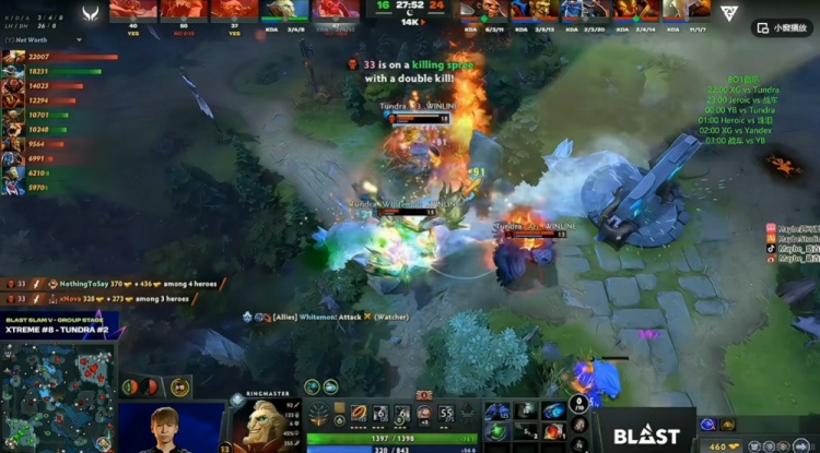 [28分钟]XG下路强动33斧王,但是Tundra抱团传送门支援到位,Pure无解肥主宰再次开斩拉满输出!Ame飞机倒下之后NTS獣面对两个残血也没办法输出了啊!这波Tundra击杀XG四人!经济差来到了16K!Tundra回头再控二代肉山!还是Pure主宰带盾!