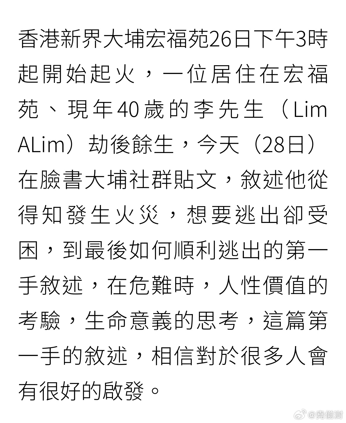 宏福苑大火|居民获救后的自救、救人、获救手记香港大埔火灾已致128人遇难香港火灾救援最新消息香港火灾直击香港大埔火灾香港大埔发生火灾港闻热点观点 事发当天我正在家中休息,当我通过太太电话通知火灾的时候,我马上换衣服准备出门。当我打开门的那一刹那,我眼前一黑、浓烟将我吞噬,我尝试打开手机的电筒功能,却伸手不见五指、呼吸困难! 我马上关门回到家中。似时有点不知所措,当我再次和太太通电话的时候,她已经悲恸欲绝;我问她,我如果尝试从逃生门冲出去,跑到大堂(大厅之一)可以逃走吗?她说,大堂已经变成火海! 这一刻,我已经知道最后的生路已经断绝。我将囚禁在这座名为「家」的炼狱之中。我只能无奈地、被动地等待,等待救援。 我冷静下来,找出家中的毛巾尽量湿水。突然,我听到门外走廊有叫声,我拿着湿毛巾,毫不犹豫冲出去,不到十秒,眼睛已经不停标眼水、喉咙感到炽热;这一刻我能确定,如果我不把走廊的人救出来,他们在这恶劣的环境中,后果一定不堪设想! 我摸着走廊的墙边,向前慢行并呼喊着「快过来」,此刻我触碰到他的身体,马上拉他们回到(我)家中。我松了一口气,而且觉得我不是孤军作战了…。在这走廊不到一分钟的时间,我感觉很难受!原来被浓烟包围的感觉是这样的。 我找出家中的毛巾给这对夫妇、给他们水,他们都穿着得很单薄而且穿着拖鞋,如果逃生起来都会很不方便,我给他们穿上袜子和鞋,换上长裤带好帽子并告诉他们,如果真的紧急关头,我们尝试在窗外跳出去,我们这是2楼、应该可以的! 我安顿好这夫妻,坐在房间好好休息,告诉他们不用担心,我们死不了的! 然后我静静地坐在窗边,目光穿过玻璃,望向窗外无数烧着的杂物,如同黑色雪花,混杂着火星,从天而降。像一场绝望的雨,这幅景象,残酷得令人窒息。 人生中,有太多事情我无法控制。我无法控制缘分的聚散,无法控制命运的起伏,无法控制挚爱之人的离去。我总以为,至少,我还能控制自己的身体,控制自己走向何方,至少,在最后关头,我还能为自己的「生」与「死」奋力一搏。 但这一次,连这最后的掌控权,也被大火无情地剥夺了。 生存,还是死亡?这个终极的哲学命题,从未如此具体而狰狞地摆在眼前。而答案,却不在我手中。 我拿起手机和认为重要的人交代,身在外国的妈妈知道事情后打电话给我,我很冷静的告诉她:「妈妈唔使担心,消防员救紧我,我冇事啦,唔同你讲住我执埋啲嘢走佬先!」收线的那一刻,我眼中带有泪光,好像有点生离死别的感觉,不停听到有爆炸的声音传出,眼前的景象熊熊烈火,这一刻我以为自己会永远留在这里。 我在窗边看到消防员的踪影,我不停挥手并利用闪灯,大概(下午)4点多的时候,消防员看到我并告诉我,他们正安排救人。我知道他们一定是尽力在救援,既然我目前还安全、我应该要等待的!我乖乖的继续等待,这种彻底的「无能为力」,比浓烟更令人窒息、我只能坐在这里。 家中的那对夫妻开始有点气喘,毕竟我们一直困在家中几小时,连呼吸一口新鲜的空气也是奢侈的。 直到傍晚六时,消防员驾起云梯告诉我们,现在会把我们逐一救出,太太(指他从走廊就住进来的那对夫妻)让我先离开,我跟她说:「我比较后生,我还可以忍受多一会、你们先离开吧。」她让我好好照顾她丈夫,帮忙协助他爬出窗外,然后(她)就坐上云梯离开。 当他们(指他从走廊就住进来的那对夫妻)都顺利离开后,再一次,只有我自己在这家中,这一刻,我很冷静的想,我到底有什么可以带走…曾经废寝忘餐、捱更抵夜喷油完成的模型、满心欢喜收藏的限量版超合金、各种名牌的奢侈品、孩子喜欢的玩具、妻子重视的东西,我什么都想带走…却什么都带不走…。 我将可以收拾更多物品的时间白白浪费了,我静在原地,环顾一片狼藉的四周,彷佛在和这个家作最后的道别,最后想多谢消防员冒着生命危险将我们救出。 此刻的我,在医院正在观察中。以前在医院的时候,都很心急什么时候出院、好想快快回家…当姑娘问我会否急着出院的时候,我摇摇头默不作声….我还能回家吗? 这场大火用最暴烈的方式,让我明白,在无常面前,我们从来都不是主人,只是暂时的、脆弱的栖居者。 Though times are tough, our spirit is tougher. Let’s heal and rebuild together.作者:lim alim(网名)